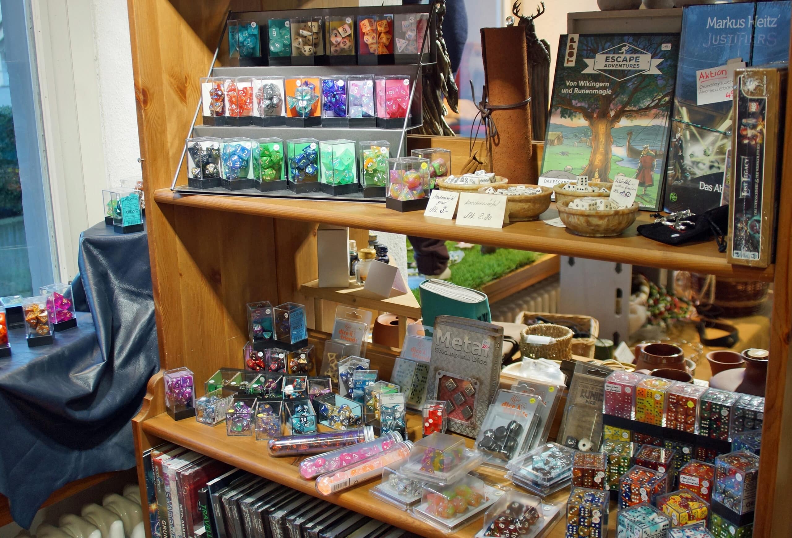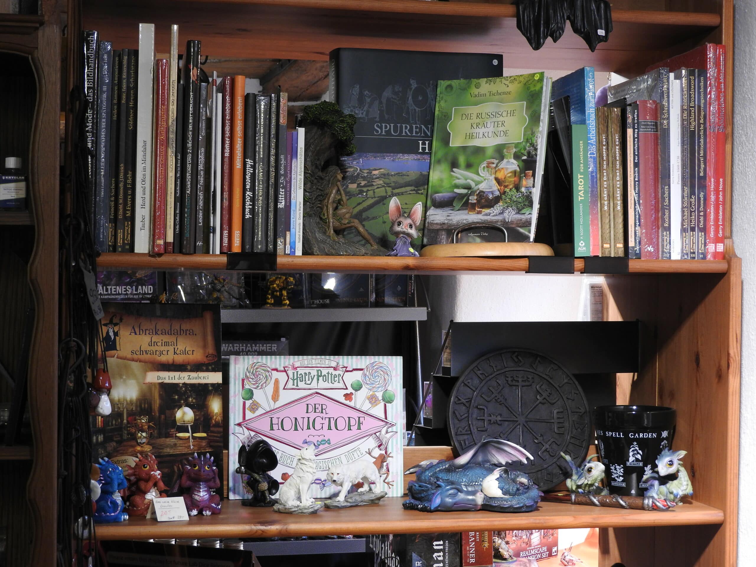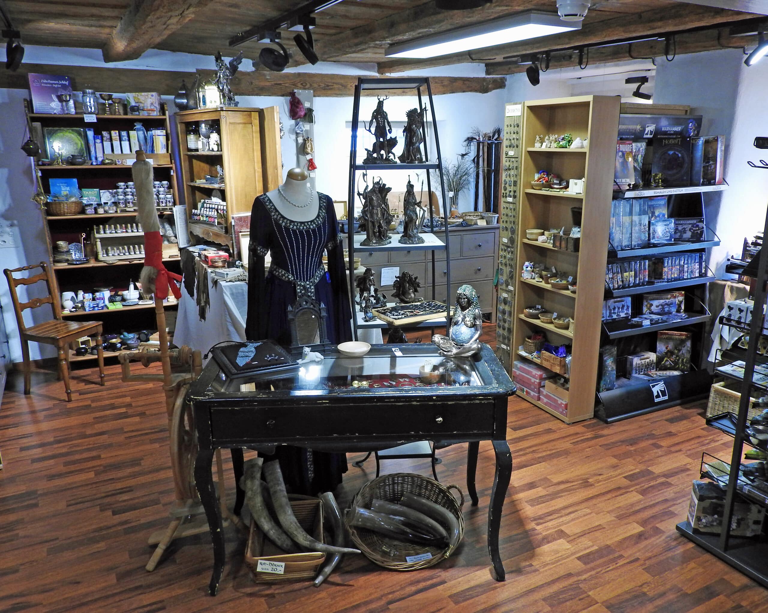 Darüber hinaus führen wir Regelwerke und Würfel für Pen&Paper-Spiele, Figuren und Farben für Warhammerbegeisterte, einiges an Bastelmaterial, das das es im herkömmlichen Bastelgeschäft nicht gibt, sowie dekorative Figuren. Unser Met-Sortiment umfasst rund 40 Sorten und für das seelische Wohlbefinden gibt es ein ansprechendes Sortiment an Räucherwaren und Zubehör.