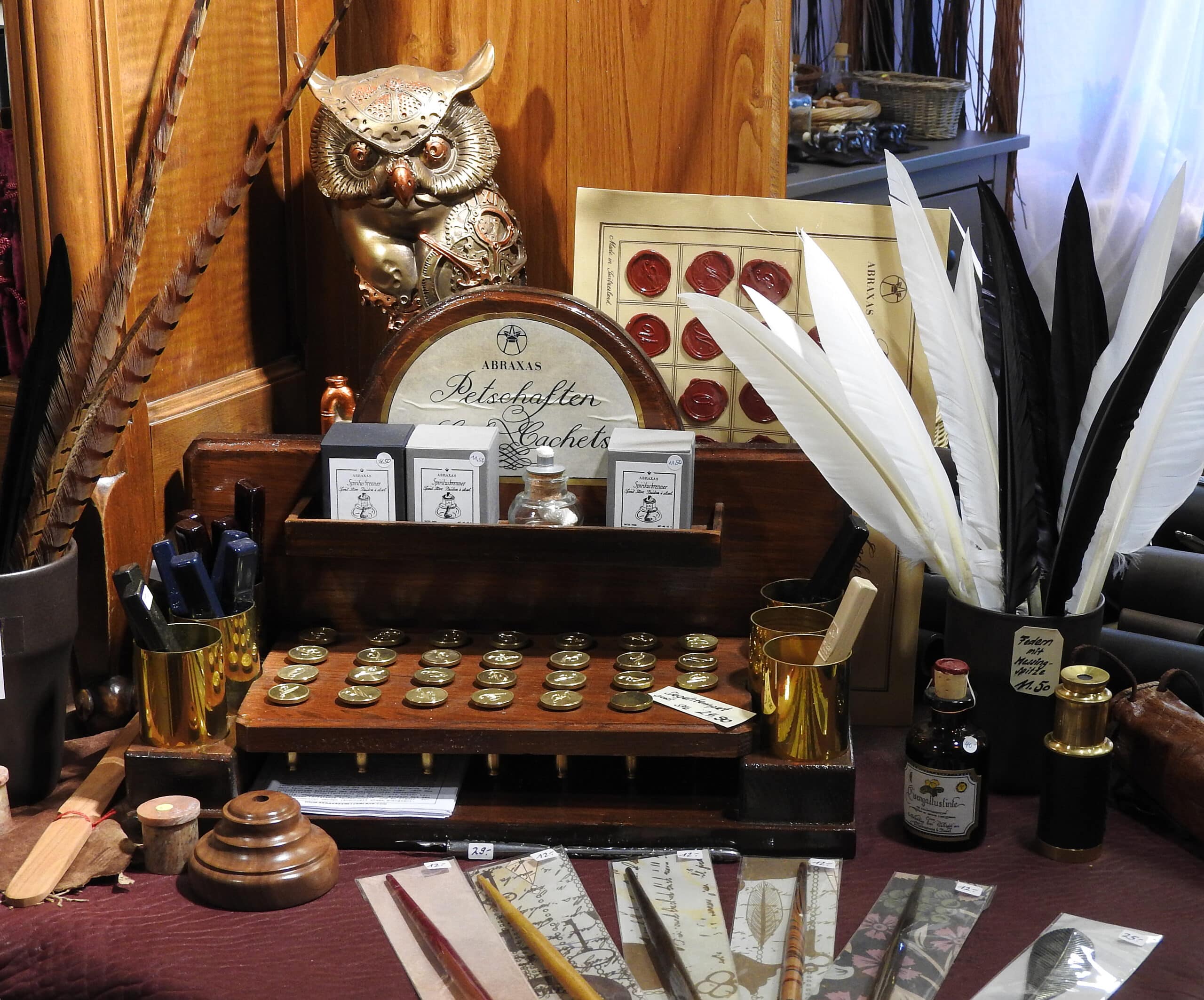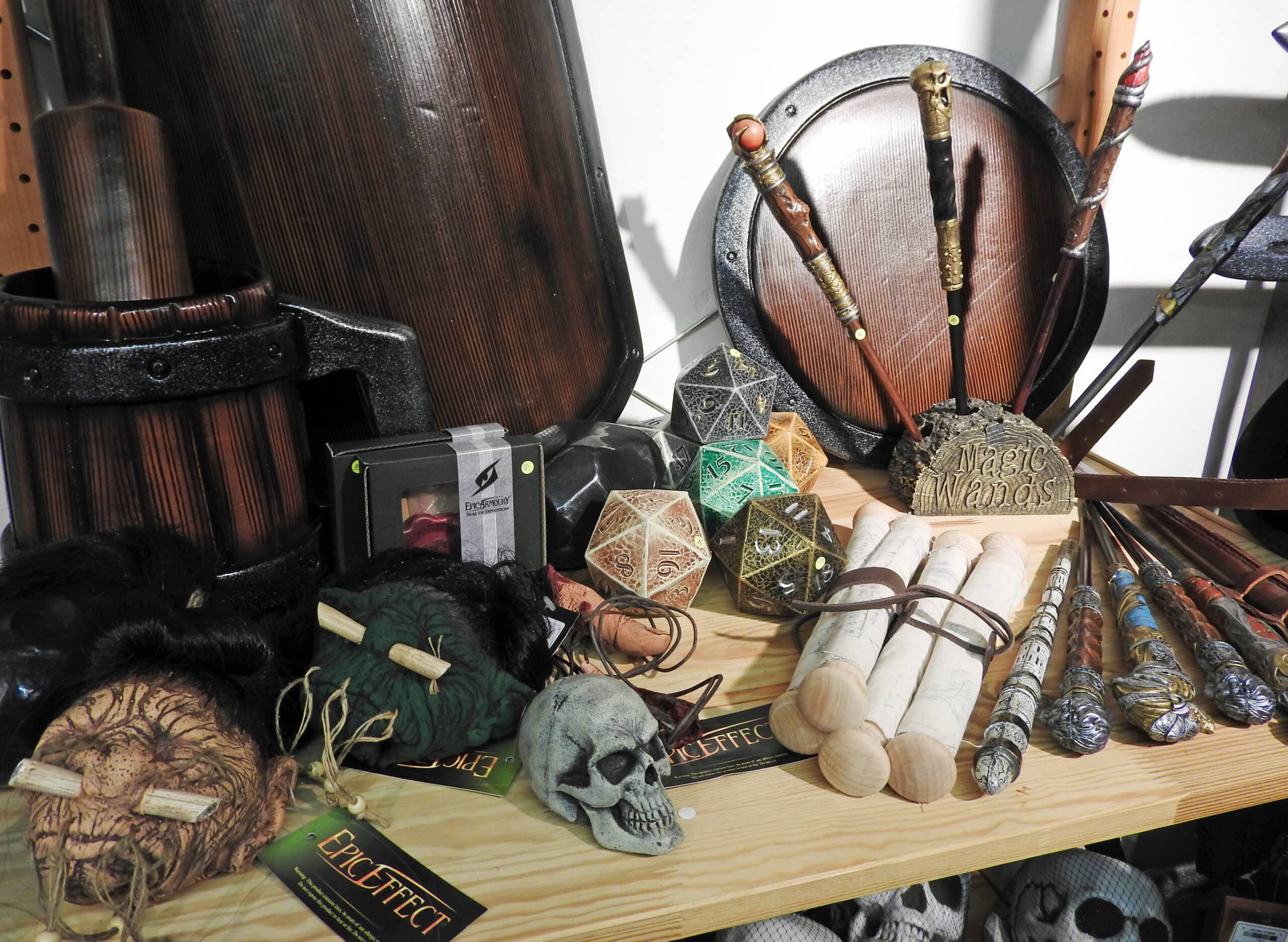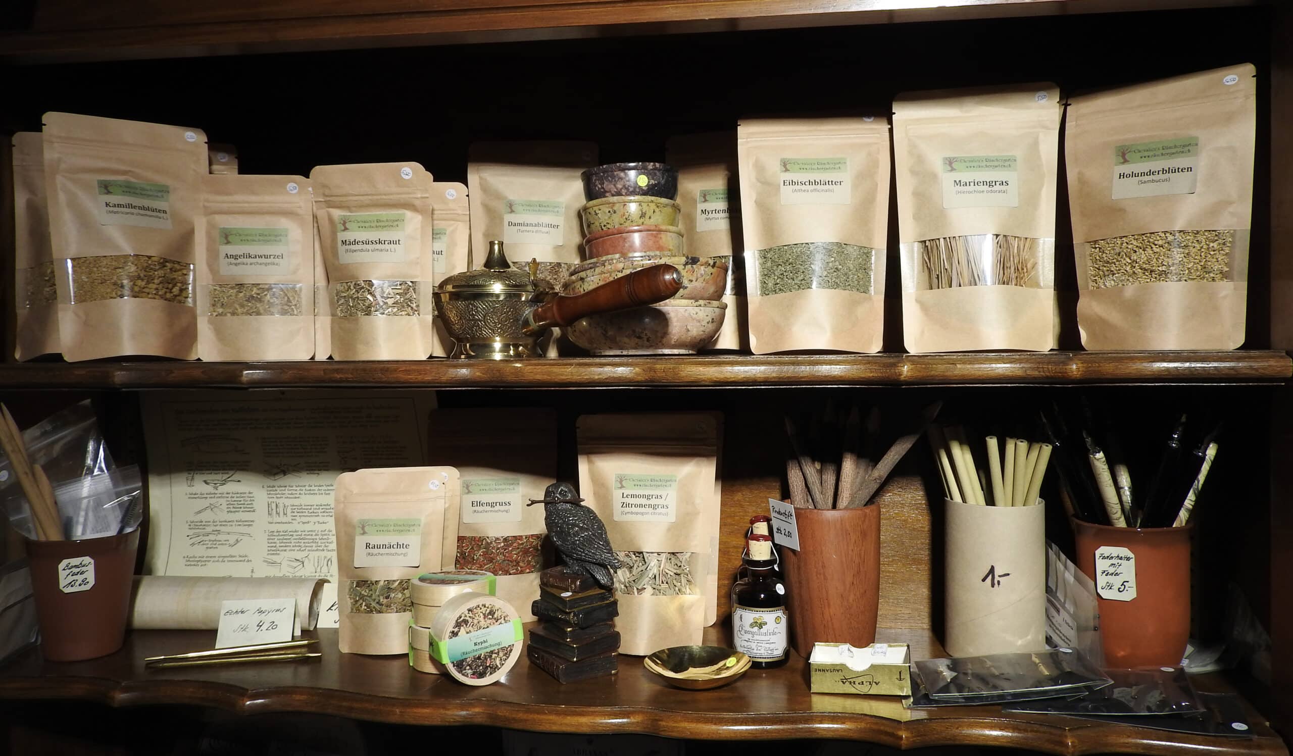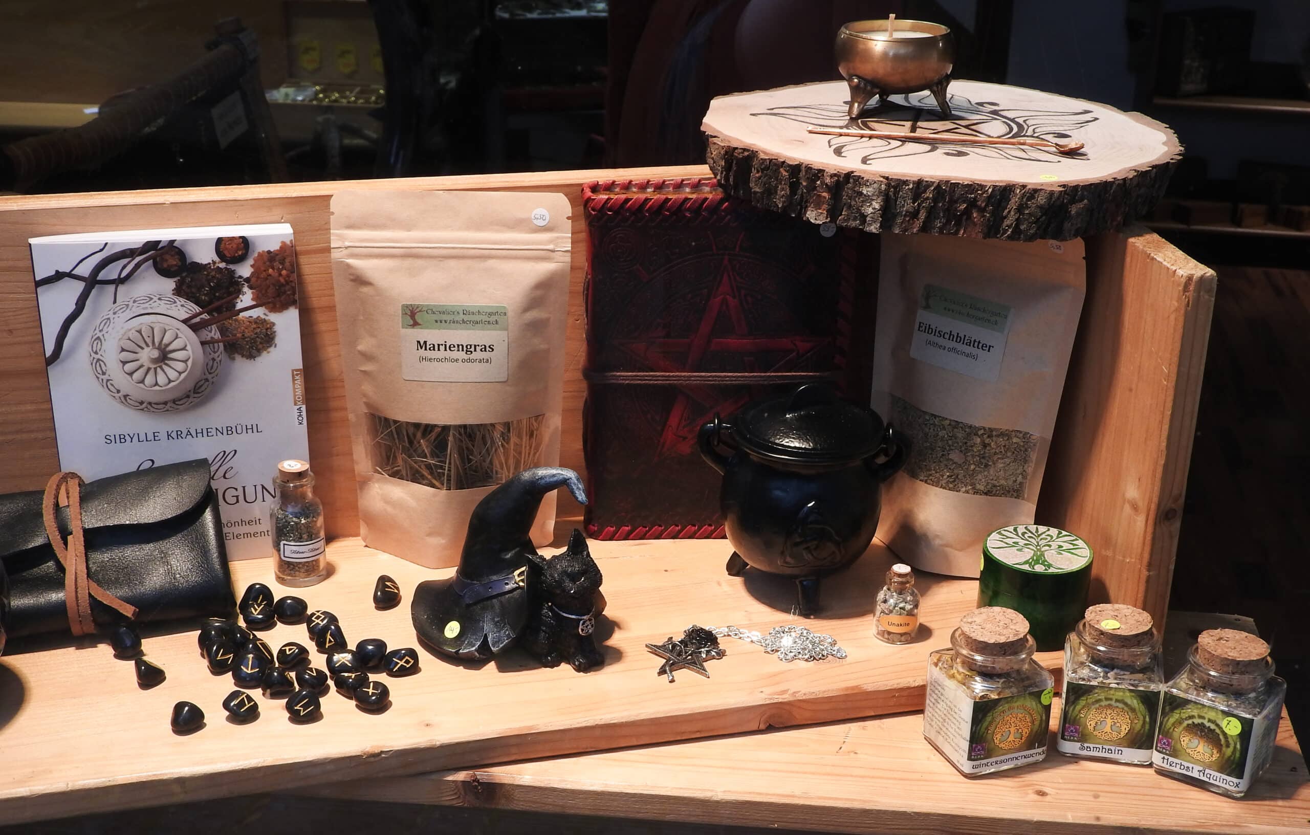 Darüber hinaus führen wir Regelwerke und Würfel für Pen&Paper-Spiele, Figuren und Farben für Warhammerbegeisterte, einiges an Bastelmaterial, das das es im herkömmlichen Bastelgeschäft nicht gibt, sowie dekorative Figuren. Unser Met-Sortiment umfasst rund 40 Sorten und für das seelische Wohlbefinden gibt es ein ansprechendes Sortiment an Räucherwaren und Zubehör.