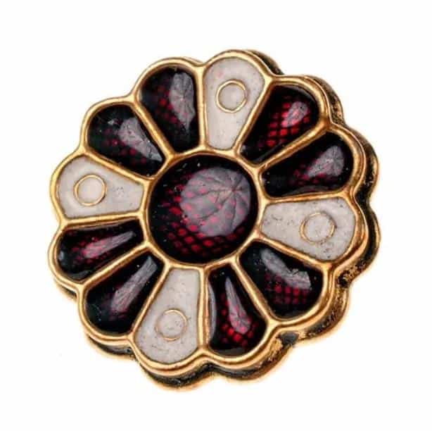 Anders als der historische Originalfund ist unsere Nachbildung allerdings nicht mit echtem Almandinen-Cloisonné und Perlmutt, sondern mit rotem und weissem Glasfluss versehen.