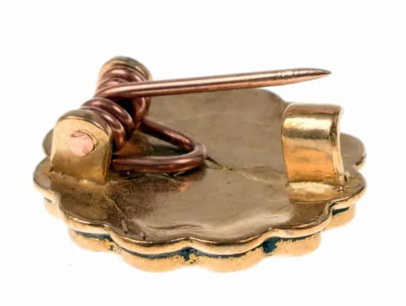 Auf der Rückseite der Rosettenfibel befindet sich eine stabile Nadel mit Spiralfeder, die der Nadel die nötige Spannung verleiht.