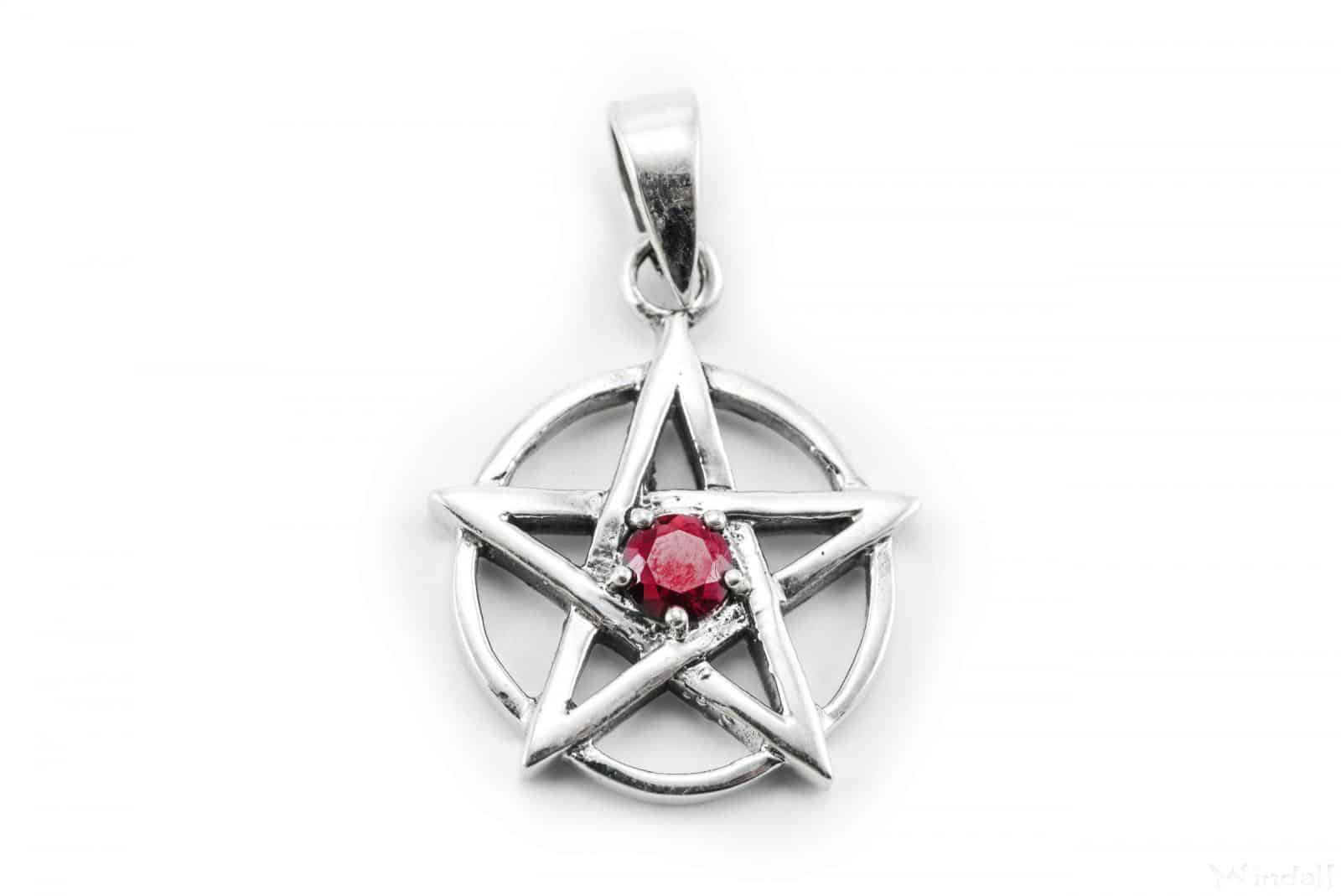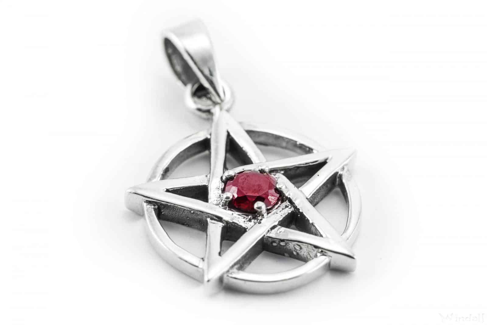 Ein kleiner Pentagrammanhänger mit rotem Glaskristall in der Mitte.