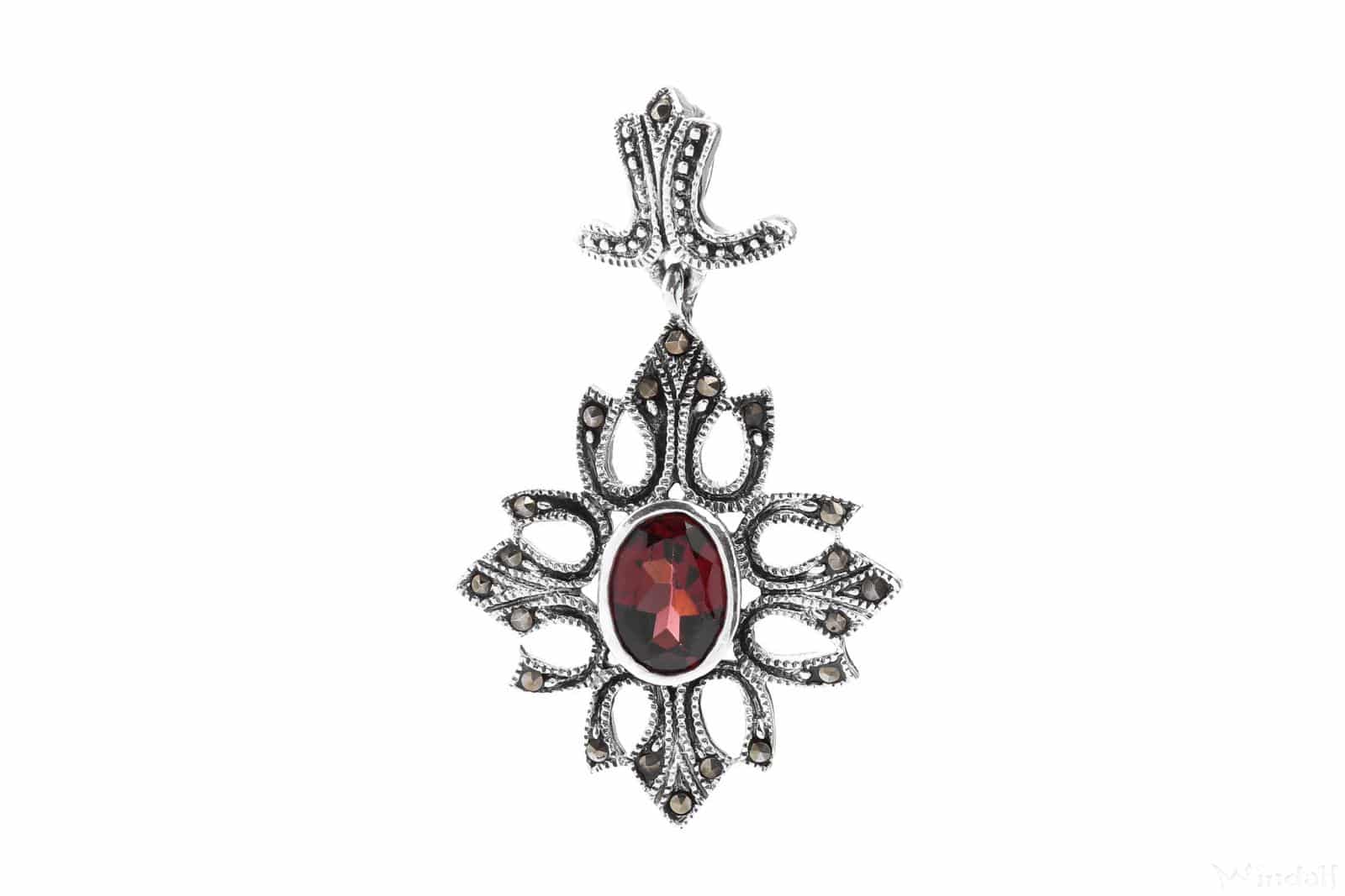 Veredelt mit einem roten Zirkonia und funkelnden Markasitsteinchen.