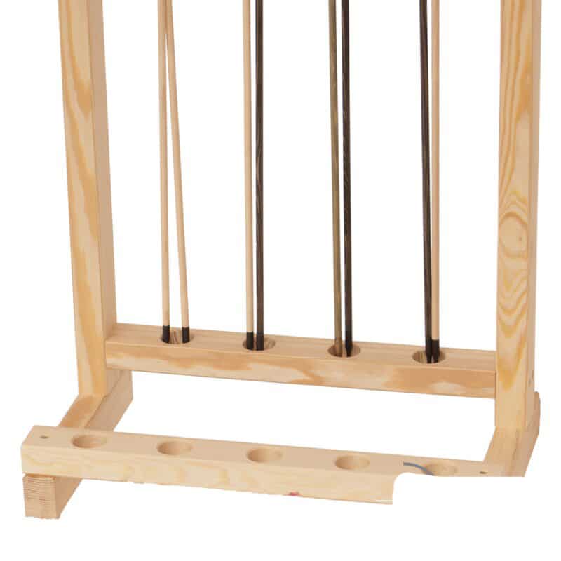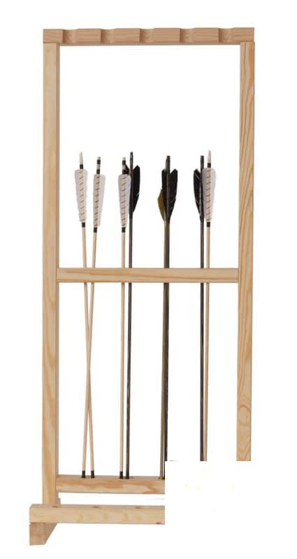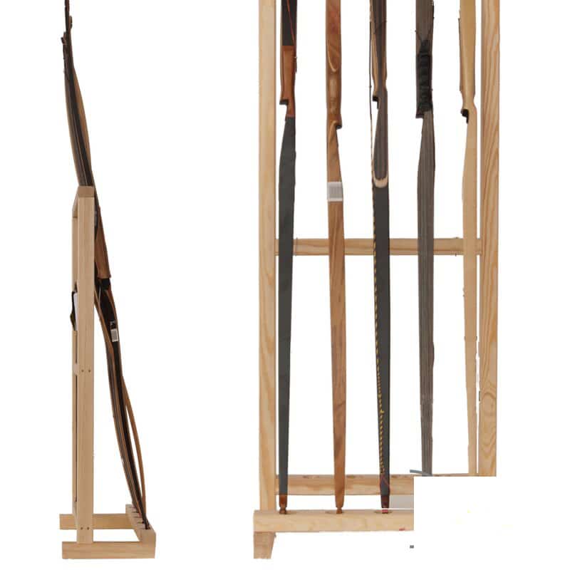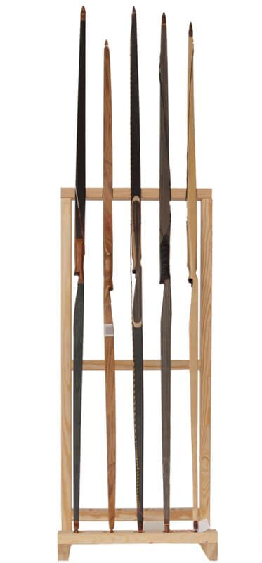 Aber auch für Einzelschützen, mit einer grösseren Bogensammlung, ist der Bogenständer interessant, denn er bietet Platz für bis zu 5 Bögen und mehrere Pfeile in 4 Öffnungen unterhalb bzw. hinter den Bögen. Die mittleren Streben haben dabei einen Abstand von ca. 47 cm, so dass sie selbst kurzen Pfeilen (ab 21 Zoll) genügend Halt geben.