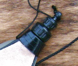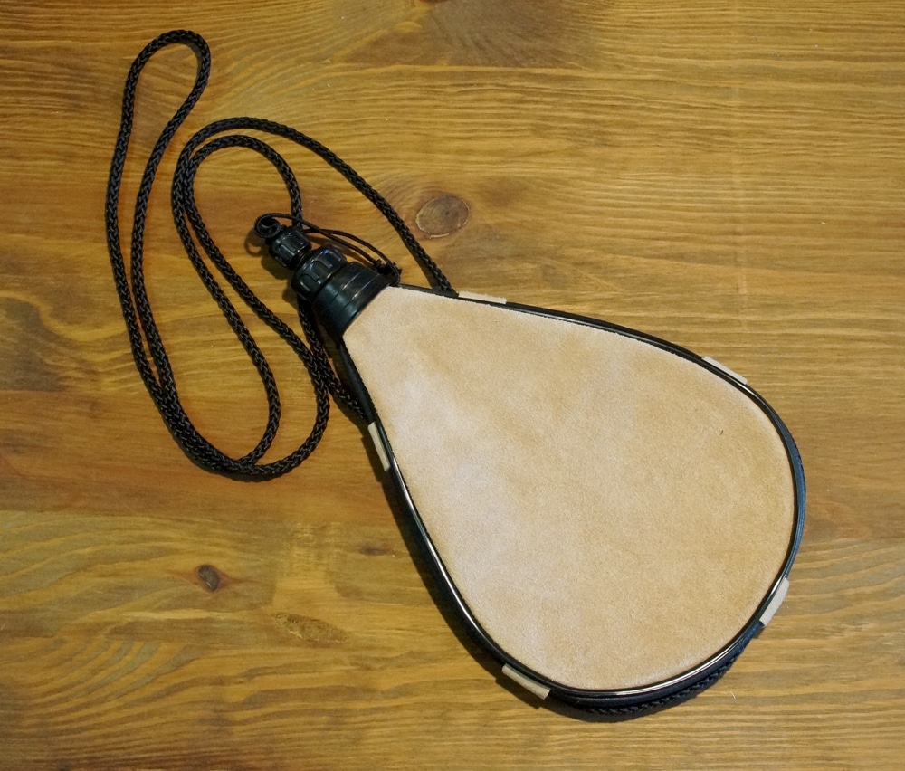 Hergestellt aus Wildleder mit hygienischem Plastikinlay, sowie Tragriemen und aufschraubbarem Verschluss.
