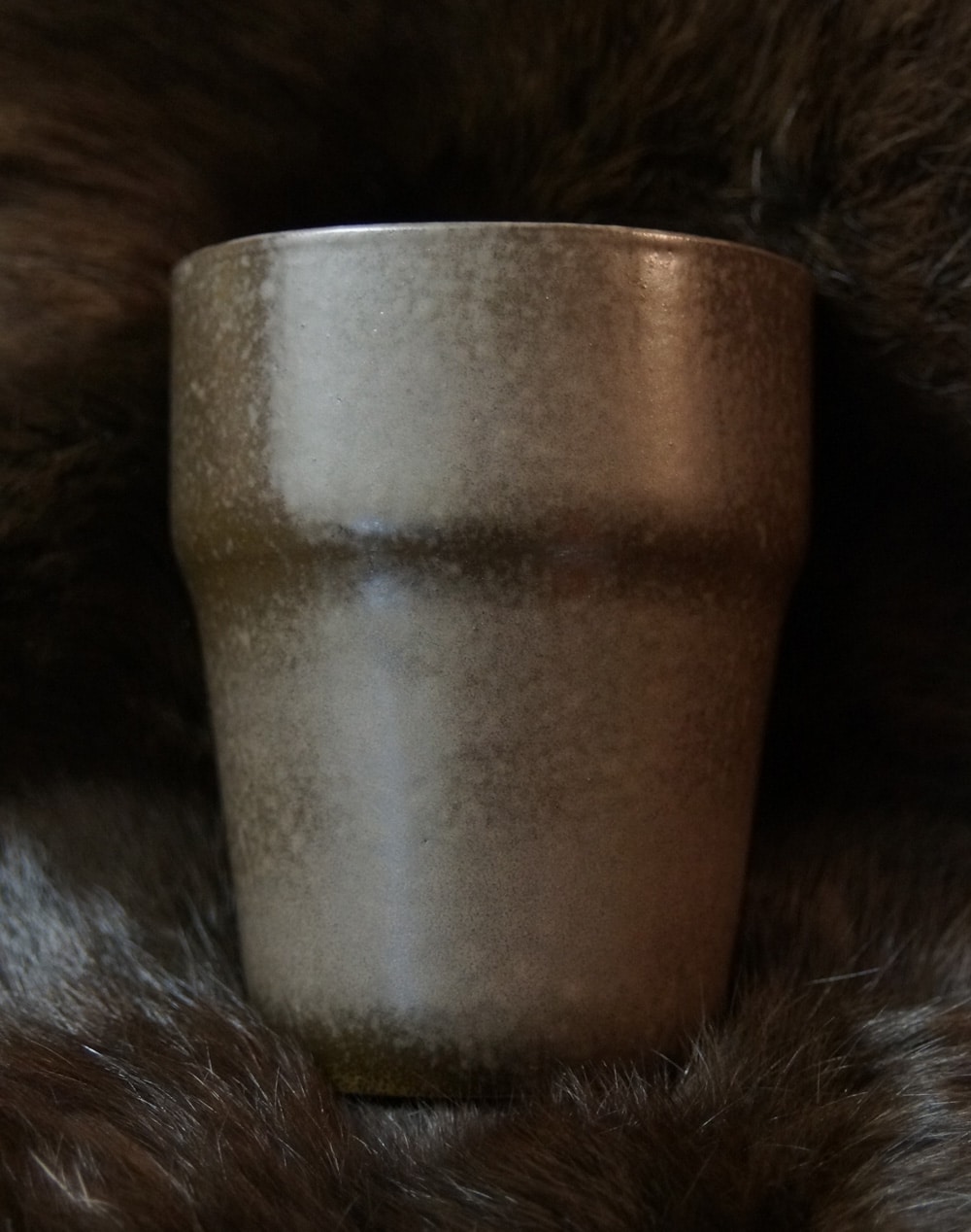 Ein schlichter aber sehr griffiger Becher aus Keramik, den man gut ineinander Stapeln kann.