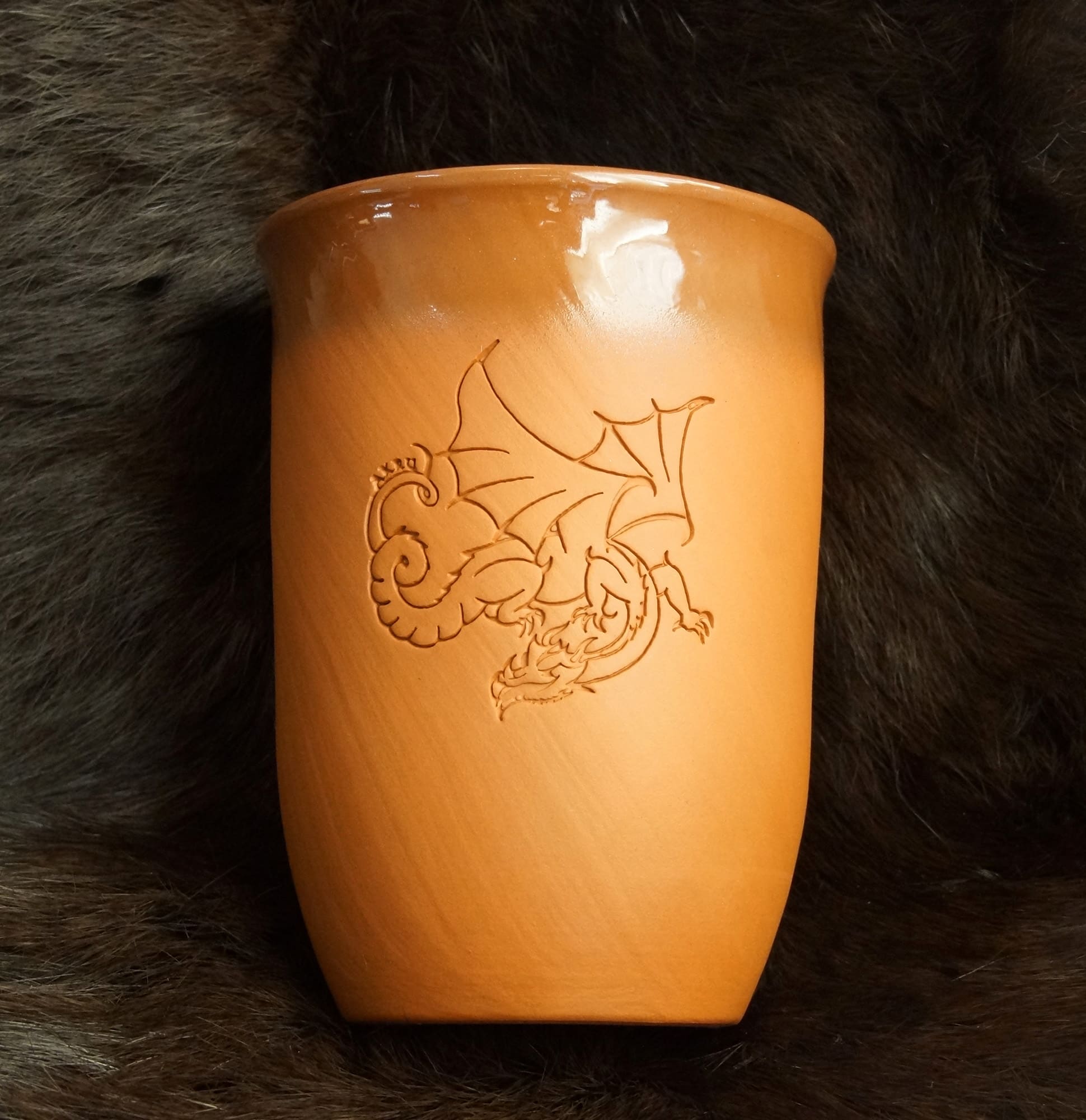 Eine schlichte Becherform, die eine schöne Drachenprägung aufweist.