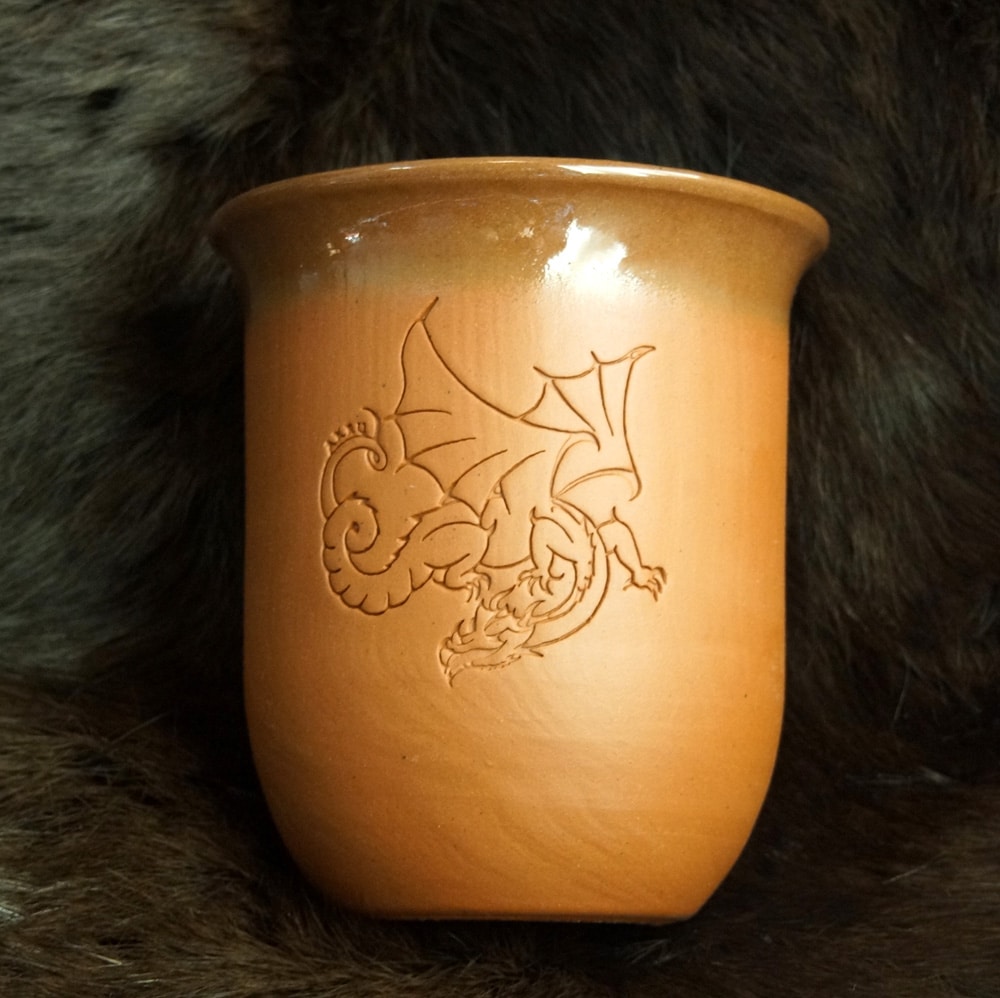 Eine schlichte Becherform, die eine schöne Drachenprägung aufweist.
