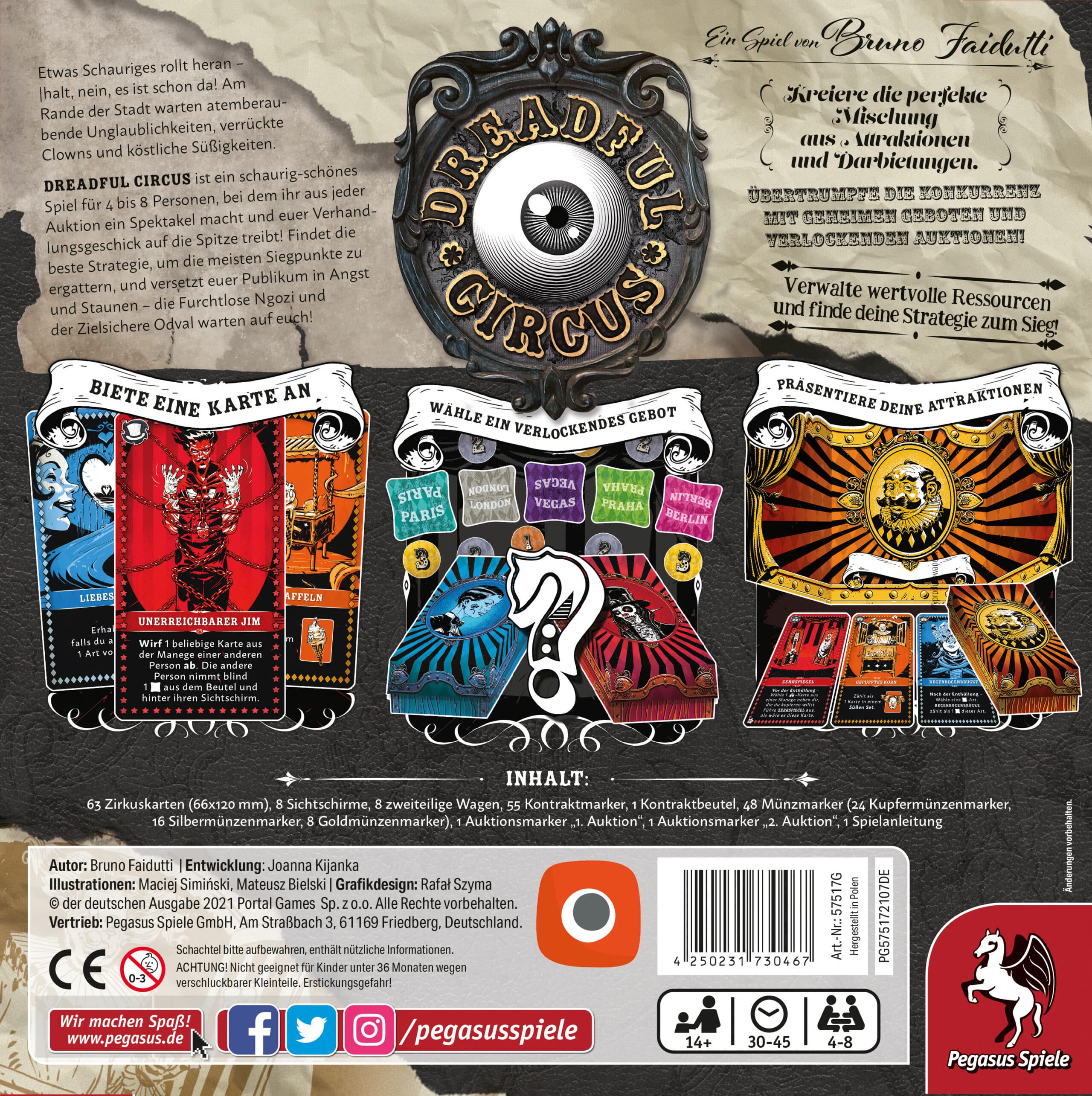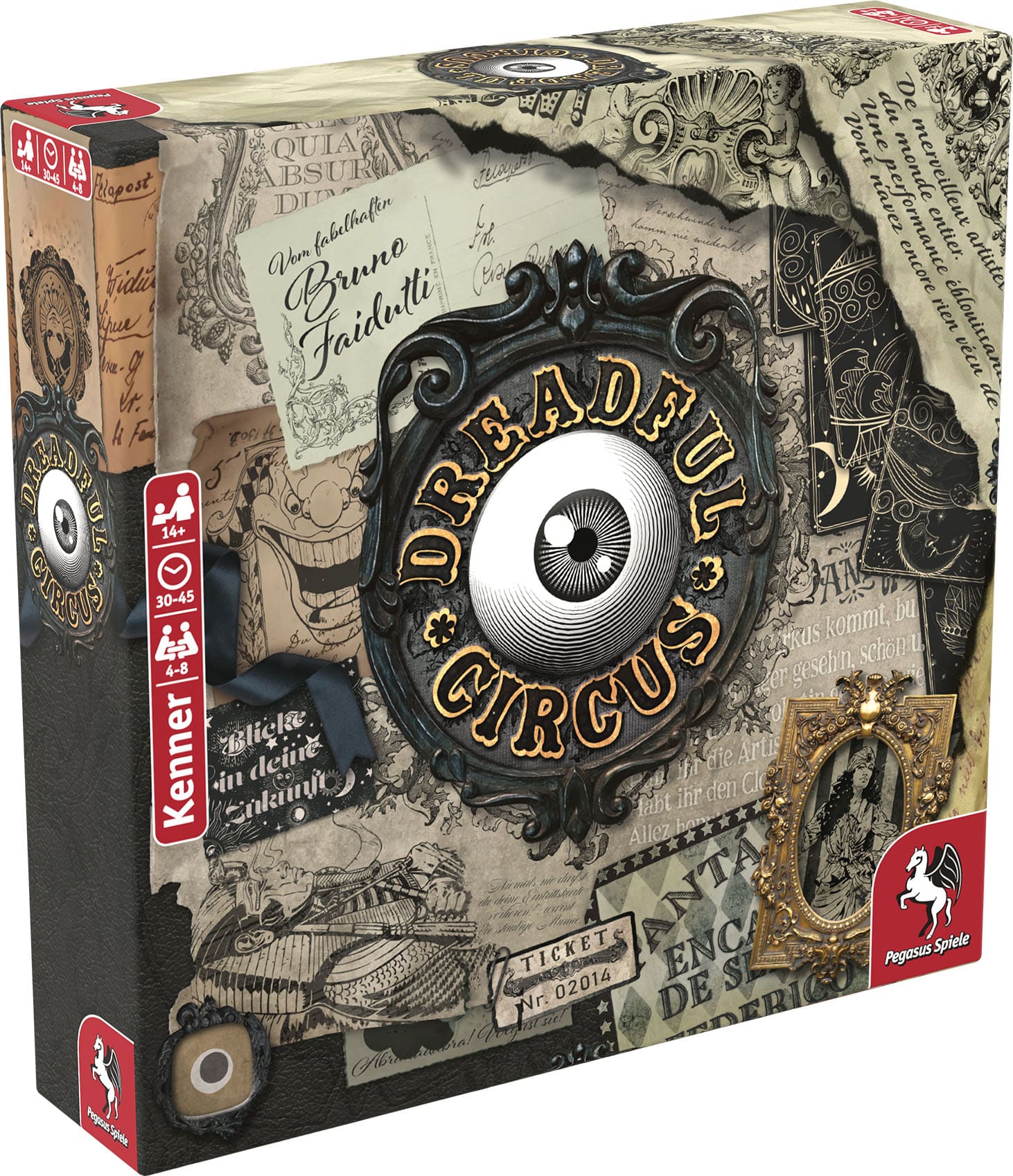Dreadful Circus ist ein schaurig-schönes Kennerspiel von Bruno Faidutti für 4 bis 8 Personen, bei dem die Spieler aus jeder Auktion ein Spektakel machen und ihr Verhandlungsgeschick auf die Spitze treiben. Wer findet die beste Strategie, um die meisten Siegpunkte zu ergattern, und versetzt sein Publikum in Angst und Staunen? Die Furchtlose Ngozi, der Zielsichere Odval und viele andere Künstler warten schon! Jede Partie spielt sich anders.