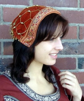 Im vorderen Teil mit der Borte drauf ist eine Art Haarreif aus Kunststoff versteckt, so kann diese Haube von jeder getragen werden, egal welche Kopfgrösse sie hat.