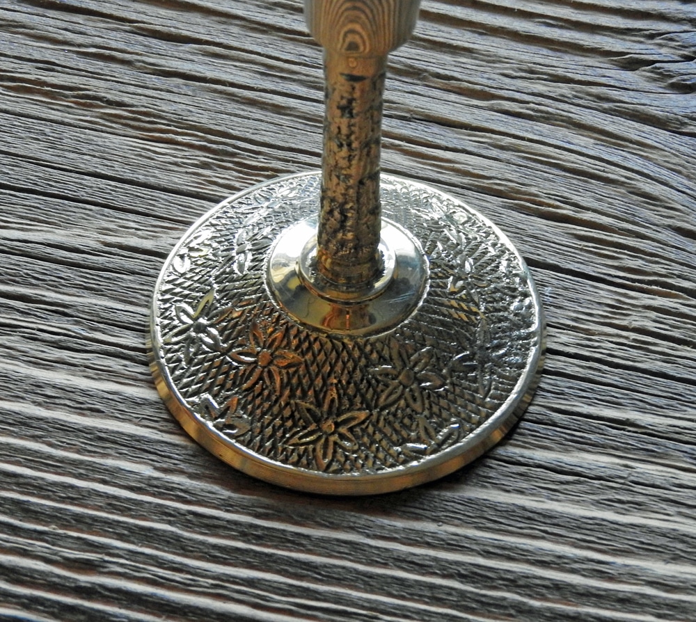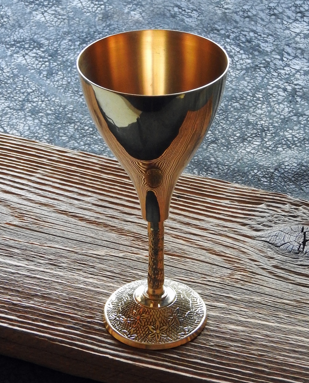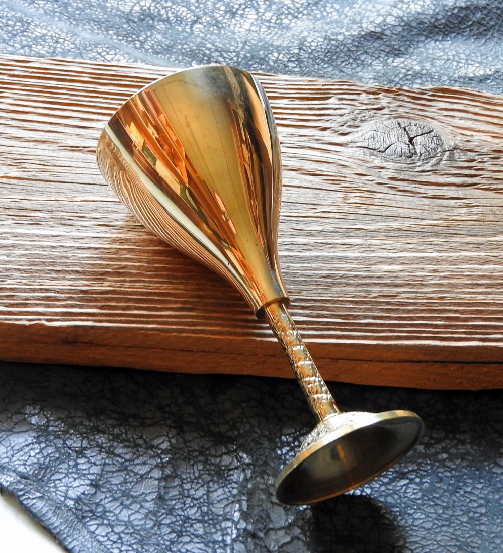 Ein schlichter und doch eleganter Kelch aus Messing mit Musterung an Stiel und Sockel.