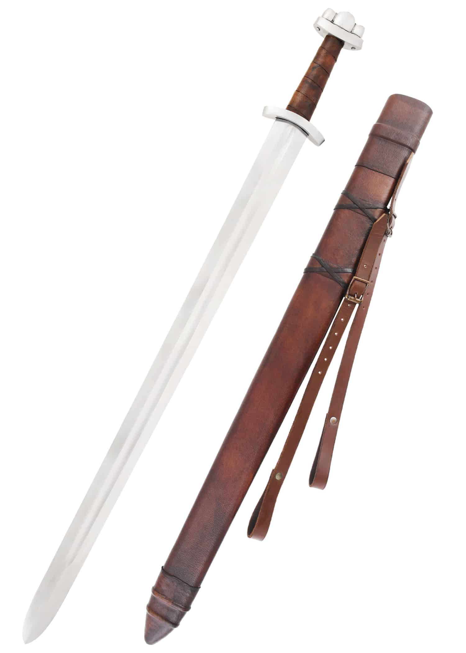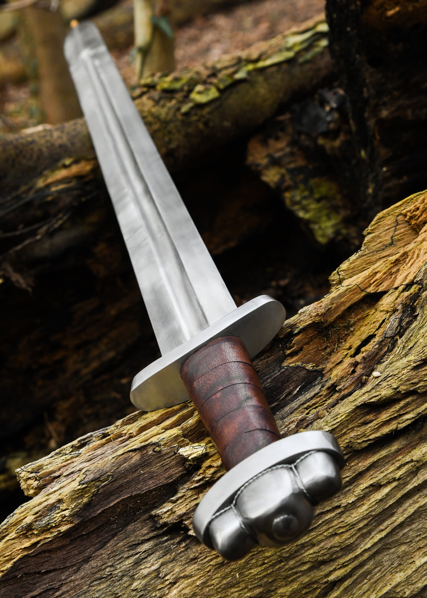 Dieses Schwert ist ausschließlich in Handarbeit gefertigt. Die Parierstange und der Knauf mit den drei Wülsten sind aus wärmebehandeltem, schmiedbarem Gusseisen. Die Klinge aus Federstahl ist bis zum Knauf durchgehend und dort handvernietet. Der Griff ist mit breitem Lederband umwickelt. Die Klinge verfügt über eine ausgeprägte Hohlkehle, welche dem Schwert große Elastizität und zugleich Leichtigkeit verleiht. Sie ist auf ca. 48-50 HRC in Öl gehärtet. Die Klingenschneiden sind nicht geschärft.
