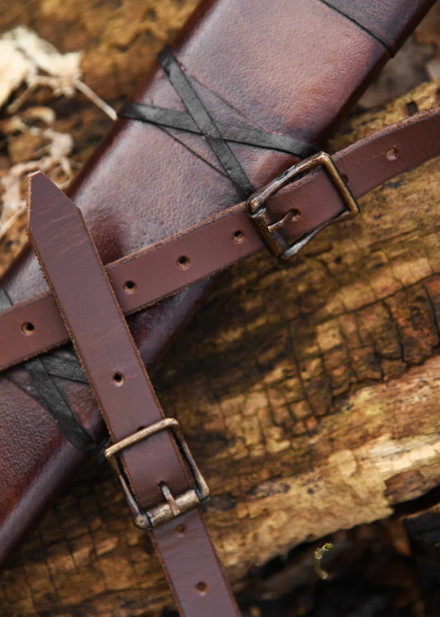 Das Schwert kommt mit einer sehr schönen Holz-Lederscheide mit zwei an Riemen befestigten Schnallen. Man kann dort z.B. Riemen einer eigenen Schwertbefestigung einschnallen.