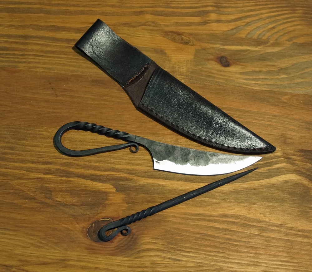 Dieses niedliche, kleine Messer mit Dorn weist eine kunstvoll tordiertem Griff aus einem einzigen Stück Eisen von Hand geschmiedet und orientiert sich an Originalfunden der nachchristlichen Einsenzeit. Oft werden solche Messer auch der Wikingerzeit zugeordnet, was aber definitiv nicht der Fall ist, da diese im Fundmaterial des Mittelalters nicht auftauchen.