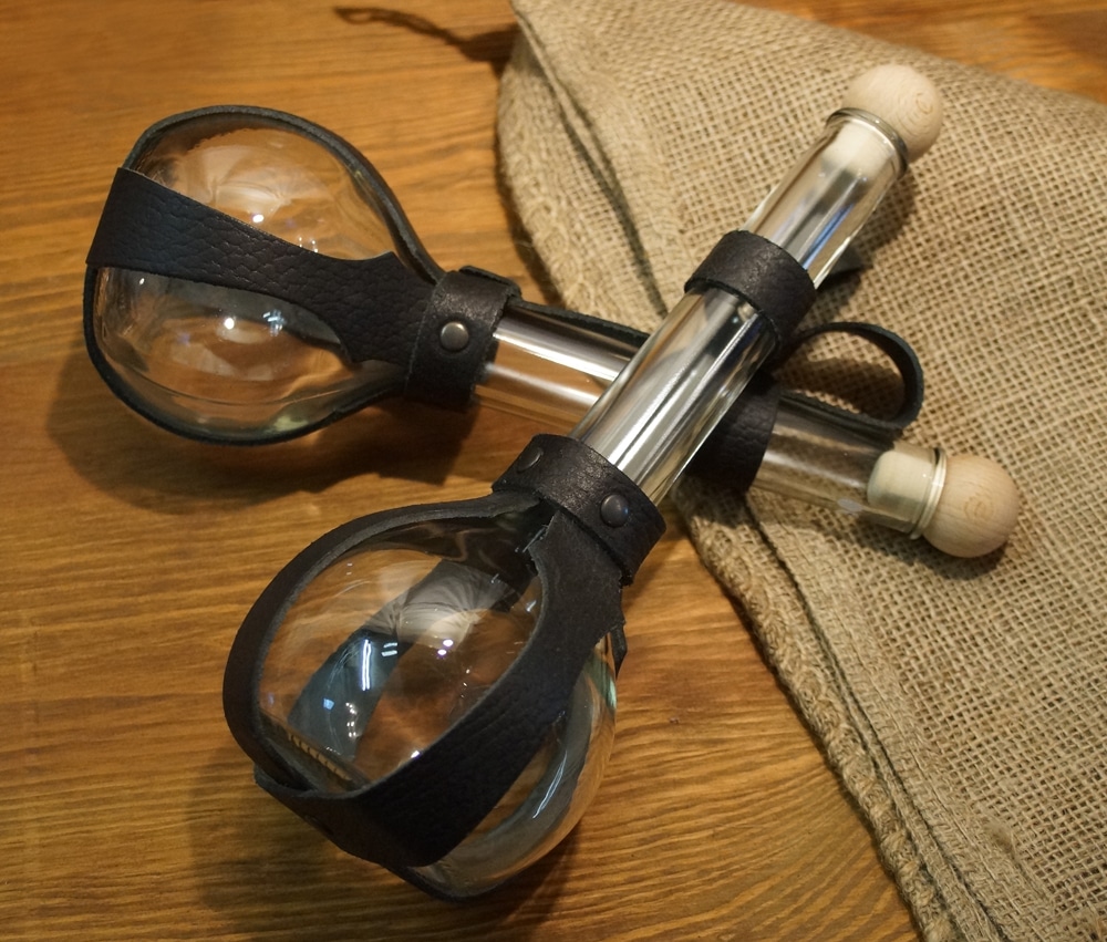 Aus dickem Pressglas hergestellt halten diese Flaschen durchaus auch einen kräftigen Puff aus. Verschlossen wird die Flasche mit einem kleinen Korken.