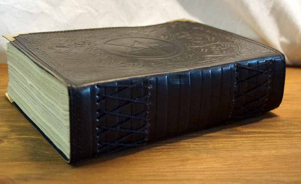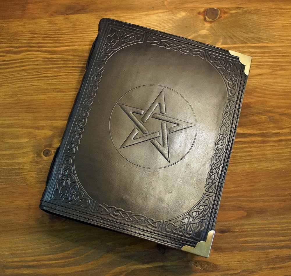 Es ist sowohl vorn als auch hinten ein Pentagramm und ein Rahmen aus Keltenknoten eingeprägt. Zusätzlich ist dieses Buch mit Buchecken aus Messing ausgestattet, um schnellem verschleiss entgegenzuwirken.