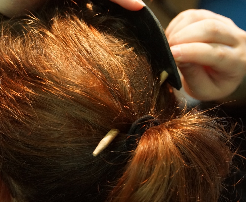 Mit einem Herkömmlichen Haargummi einen Pferdeschwanz machen, die Knochennadel durch das eine Loch stecken und dann durch die Haare (über dem Gummi durch!) und auf der anderen Seite ins zweite Loch. Und fertig.