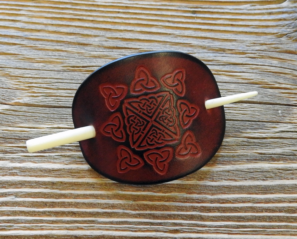 Diese traumhaft schönen Haarspangen werden aus einem pflanzlich gegerbten Rinderkernleder von 3 – 3,5 mm Stärke gefertigt und sind mit wunderbaren Prägearbeiten und der Triskele versehen.