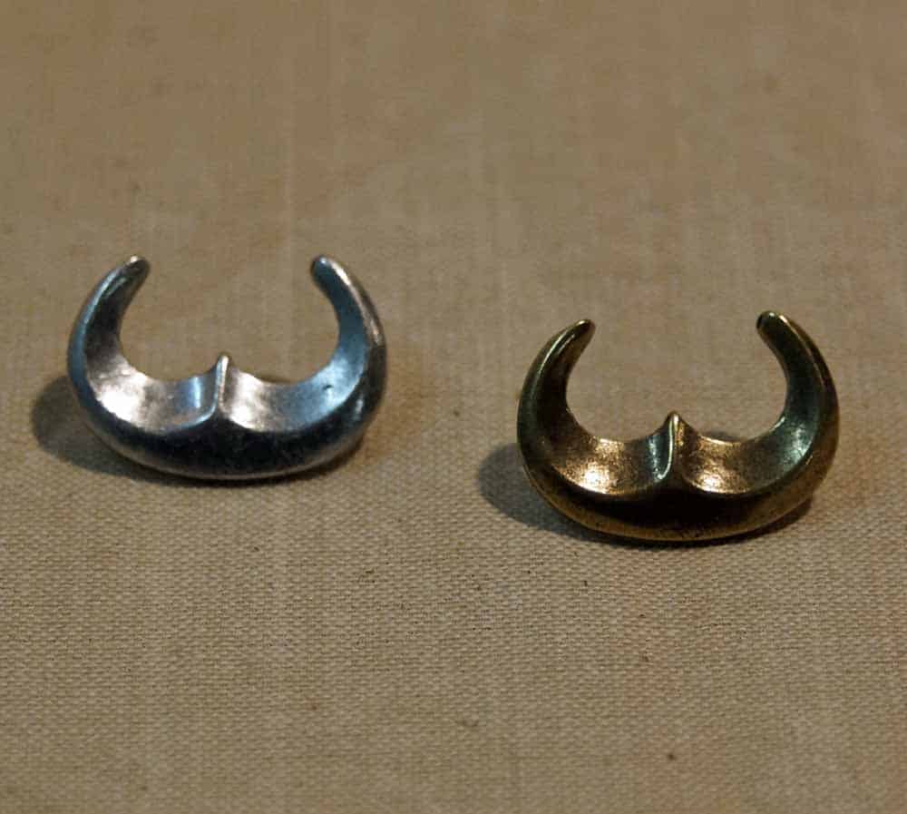 Auf der Rückseite befinden sich zwei kleine Nietstifte, wodurch die Beschläge mit den beiliegenden Hohlnietkappen durch sanfte Hammerschläge unkompliziert auf dem Trägermaterial befestigt werden können.