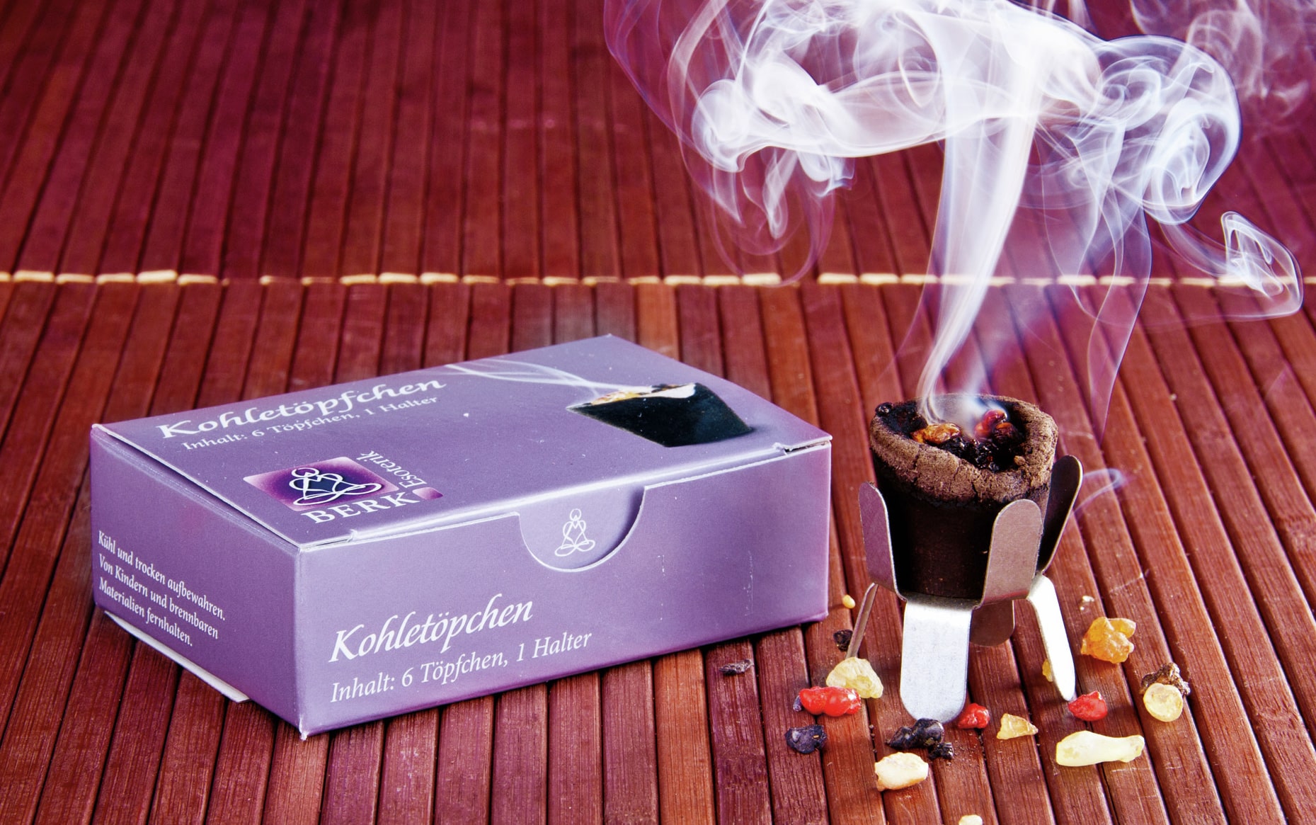 Kohletöpfchen entzünden und auf den mitgelieferten Ständer setzen, danach mit dem Räucherstoff Ihrer Wahl füllen und der Räucherspass kann beginnen.
