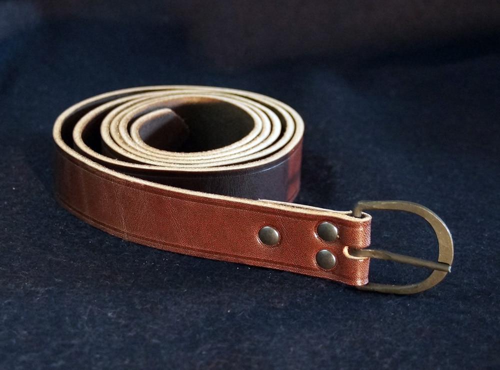 Dieser Gürtel hat eine handgeschmiedete Schnalle aus Eisen und wurde nach Vorbildern von mittelalterlichen Gürteln entworfen.
