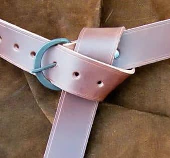 Dieser Gürtel hat eine handgeschmiedete Schnalle aus Eisen und wurde nach Vorbildern von mittelalterlichen Gürteln entworfen.