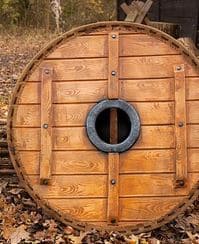Ein flacher Rundschild der durch die Bemalung und die Einfassung der Kante mit echtem Leder fast wie ein richtiger Holzschild aussieht.