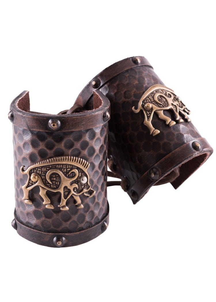Ein angenietetes, feinst detailliertes keltisches Wildschwein aus Messing mit Antik-Finish ziert die Mitte der Stulpe.