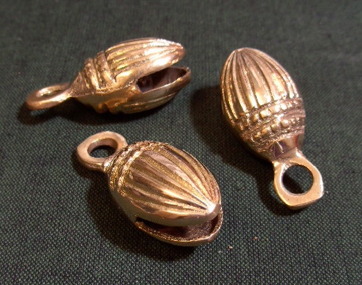 Diese massiven länglichen Schellen sind aus Messing und daher verglichen mit den herkömlichen aus Blech recht schwer.