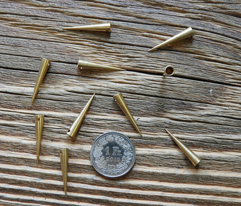 Diese Spitzen wurden aus massivem Messing gefertigt. Sie haben seitlich zwei Löcher, um sie anzunähen.