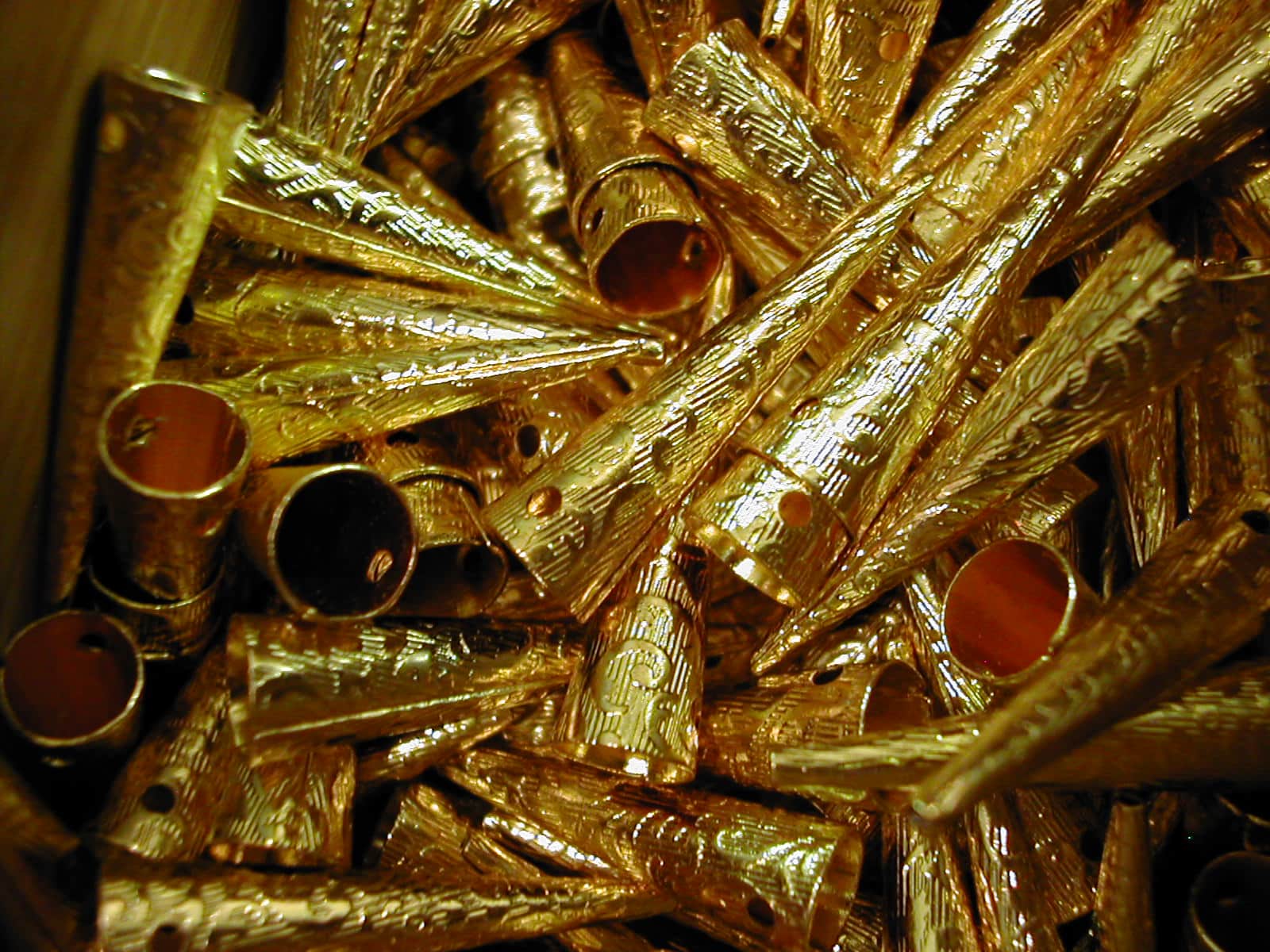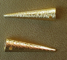 Diese Nestelspitze aus goldfarbenem Blech mit feinen Ziselierungen von Hand hergestellt.