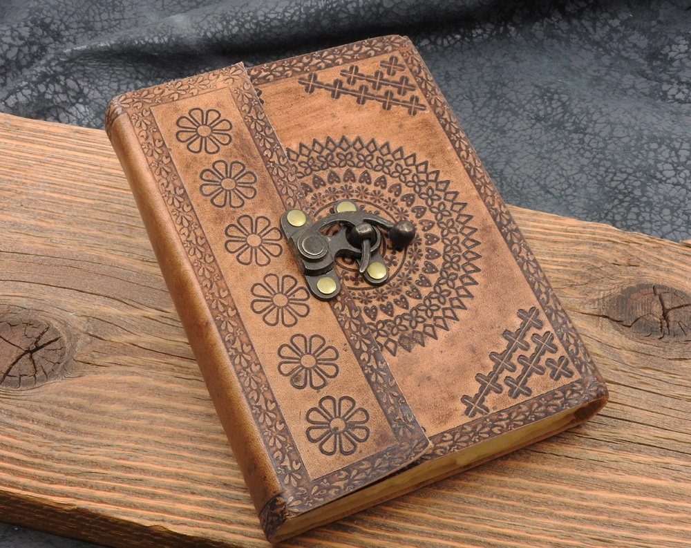 Dieses Notizbuch besteht aus handgeschöpftem Büttenpapier und einem Einband aus Leder mit einem Hakenverschluss. Das eingeprägte Mandala, in Form von vielen kleinen Ornamenten, auf dem Einband ist ein toller Hingucker und lässt dieses Notizbuch sehr antik aussehen.