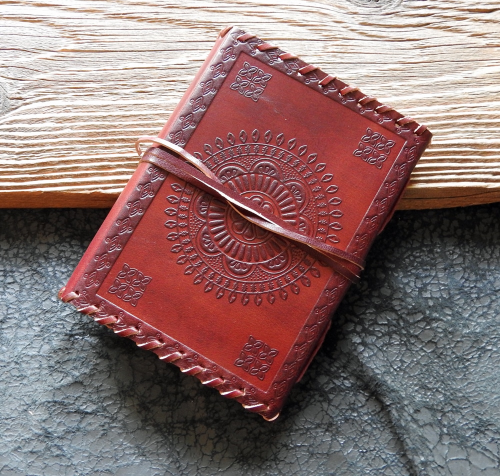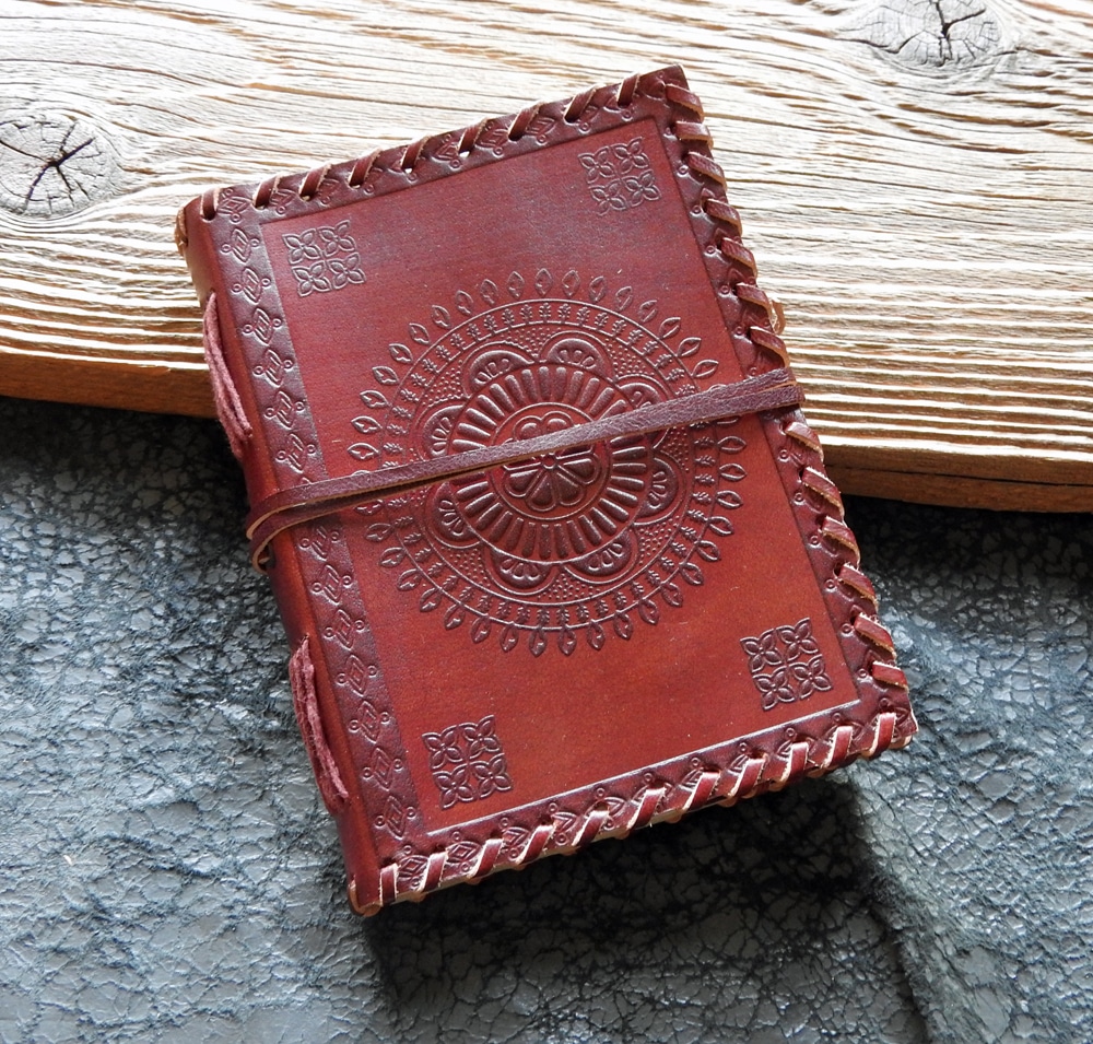 Dieses Notizbuch besteht aus handgeschöpftem Büttenpapier und einem Einband aus Leder mit eingenähten Lederbändern. Das geprägte Mandala in der Mitte prangt als Blickfang auf dem Cover.