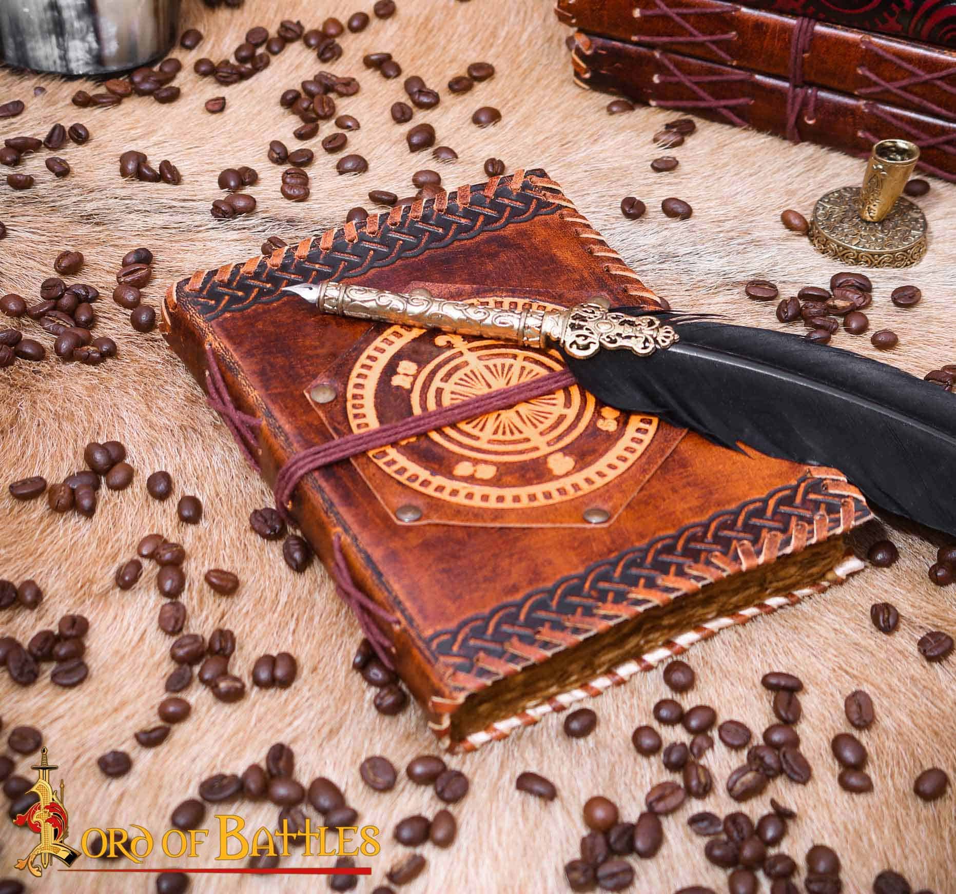 Auf dem Umschlag thront ein geprägtes Lederemblem mit Kompass, welches fest aufgenietet ist.