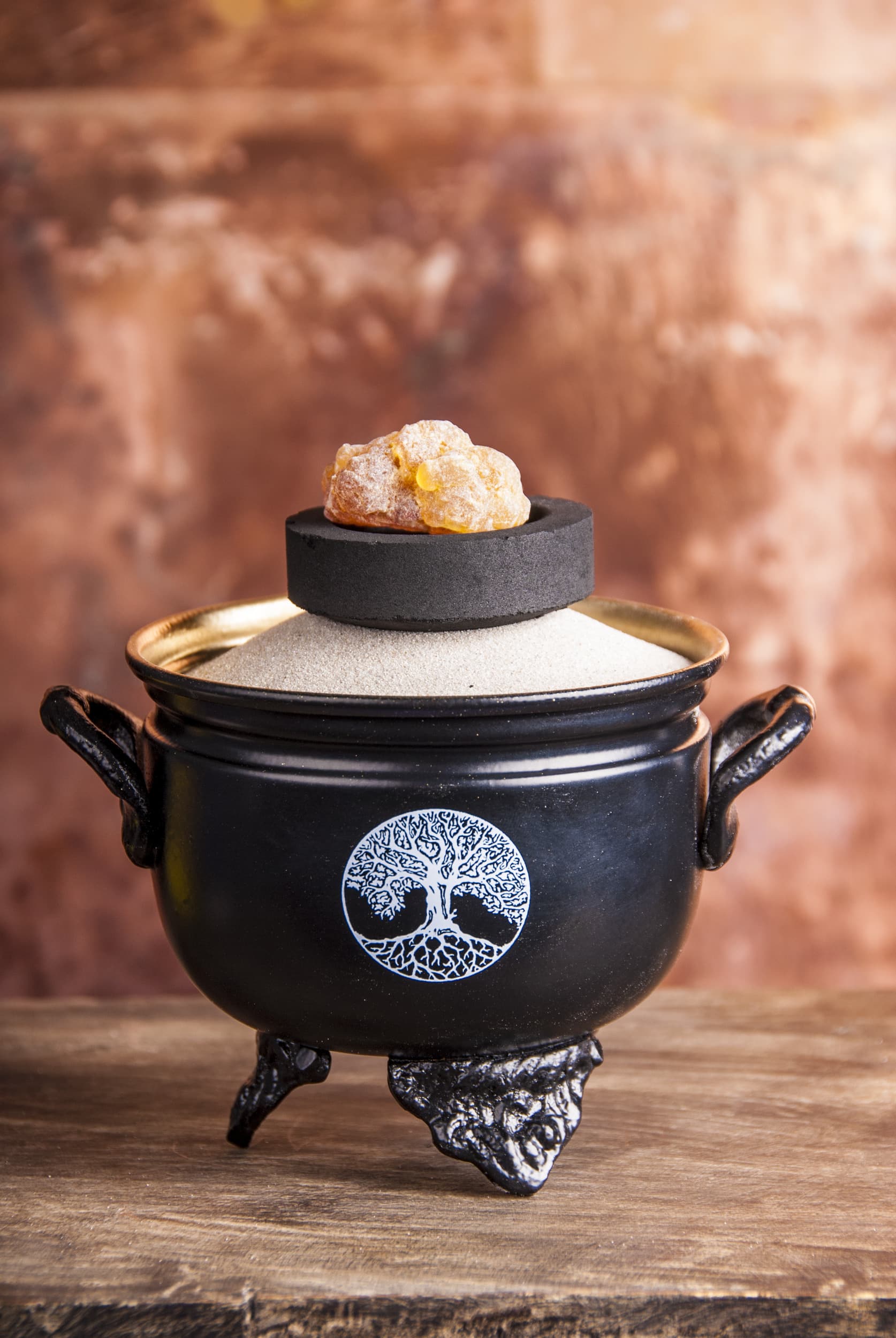 Das Kupfer im Inneren verleiht der Räucherung etwas Mystisches. Das filigrane Symbol ist zweifach auf dem Gefäss, jeweils zwischen den Henkeln.
