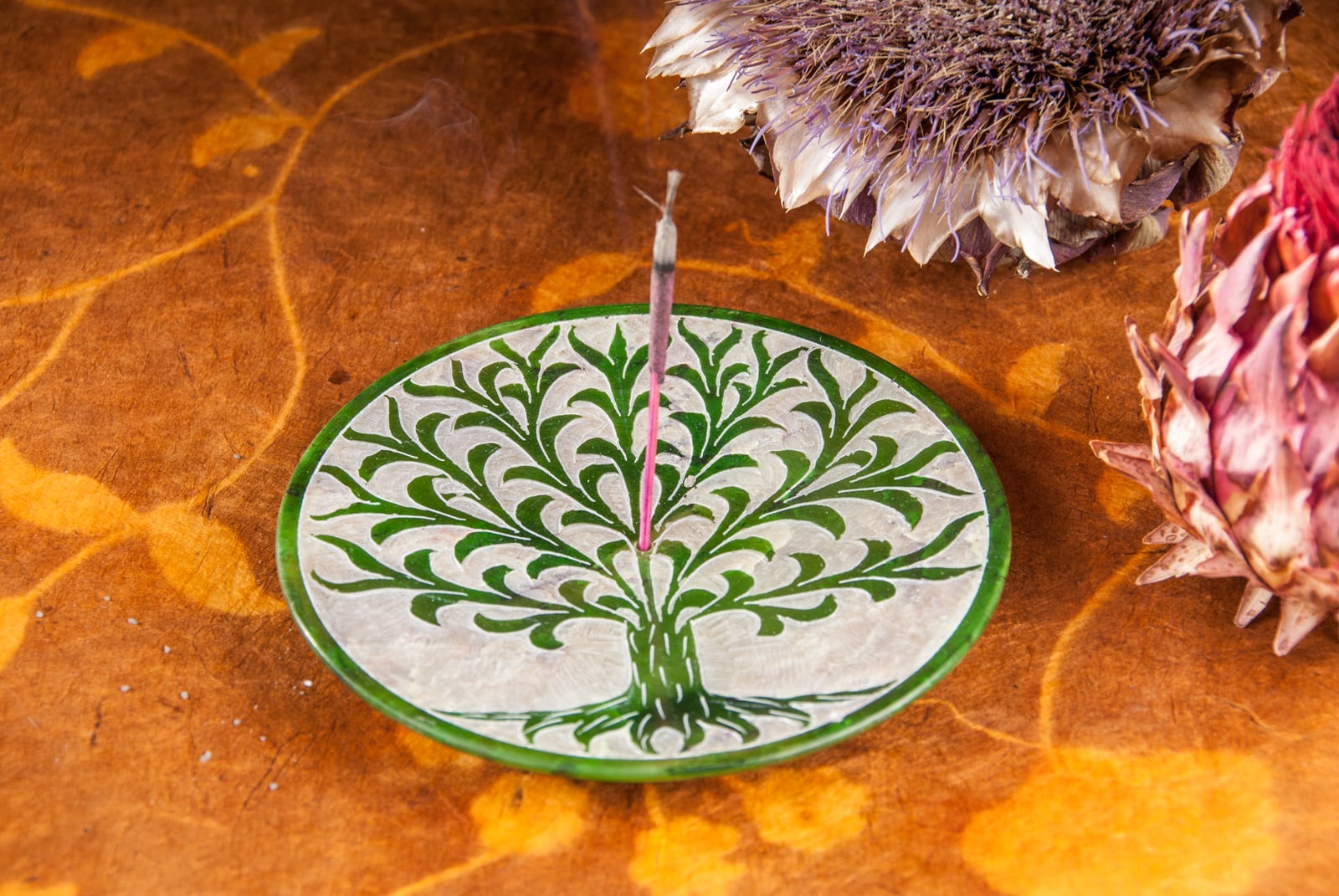 Das Räucherstäbchen wird in das Loch gesteckt und angezündet. Die Asche fällt dann auf den Teller.