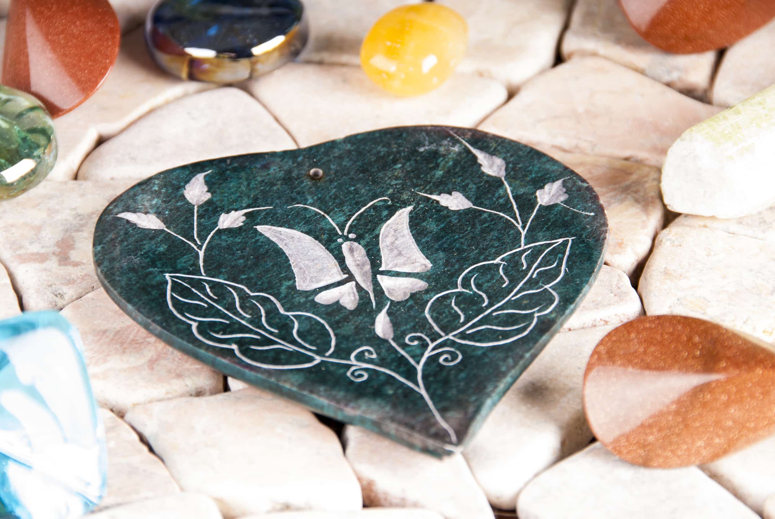 Dieser stilvolle Räucherstäbchenhalter in Herz-Form wurde aus Speckstein gefertigt. Der eingravierte Schmetterling ist ein besonderer Hingucker, der die Asche der Stäbchen auffängt.