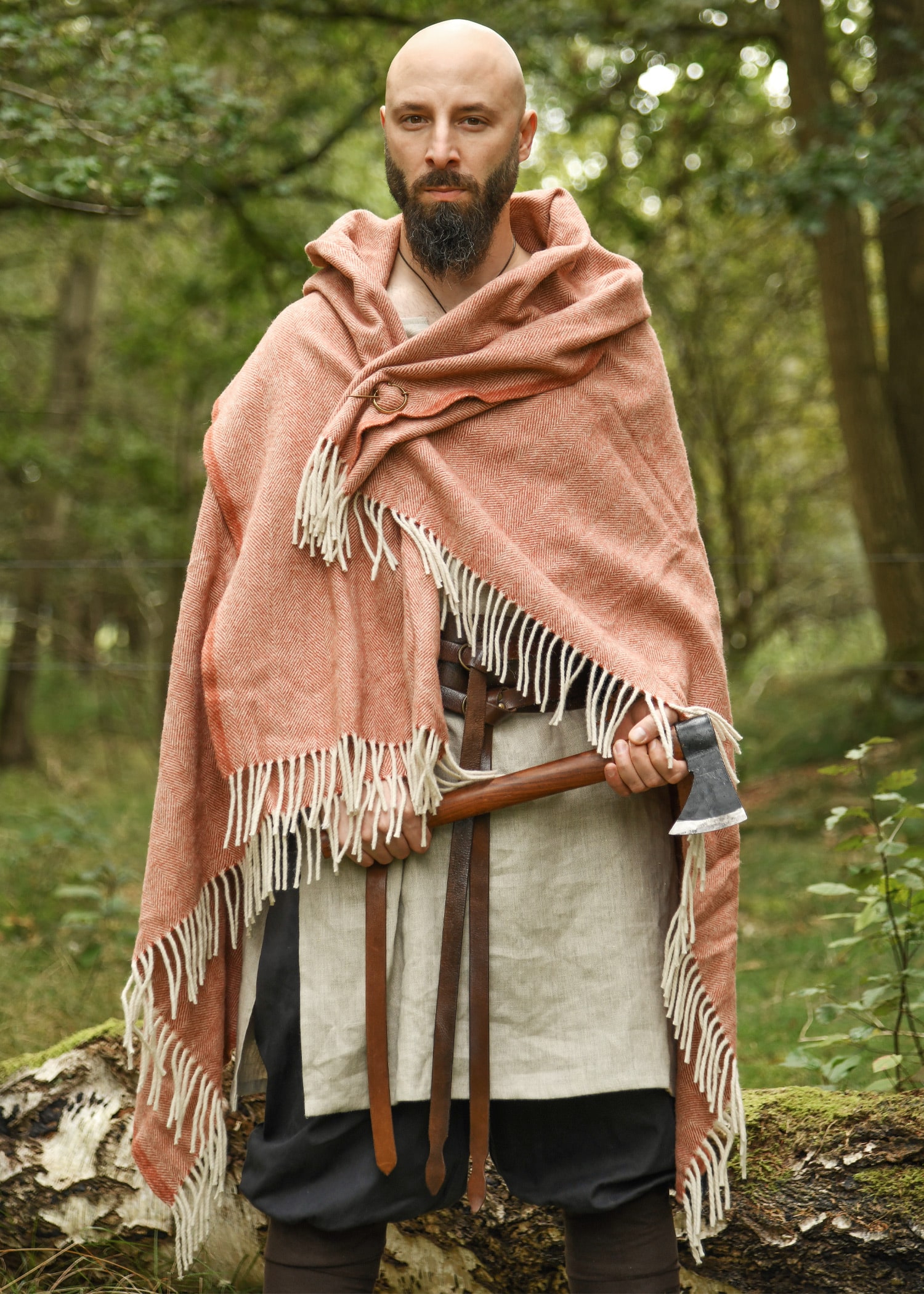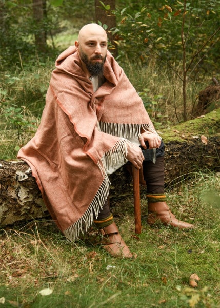 Im Frühen Mittelalter wie z.B. bei den Wikingern, kannte man oft noch keine Umhänge mit Kaputze. Man trug einen Mantel mit Ärmeln und einen Gugel mit Kaputze. Wenn man sich etwas umhängte, dann eine Rechteckige „Wolldecke“, die man mit einer Fibel (Brosche) meist an der Schulter geschlossen hat.