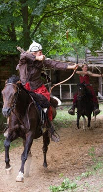 Die Skythen waren ein Reiternomadenvolk, das die Steppen nördlich des Schwarzen Meeres bevölkerte, dem heutigen Südrussland und der Ukraine. Der skythische Reiterbogen ist sehr gut für Kinder und Jugendliche, aber auch für Erwachsene mit kurzem Auszug geeignet. Der Bogen besteht aus Fiberglas mit Lederbezug und Holz.