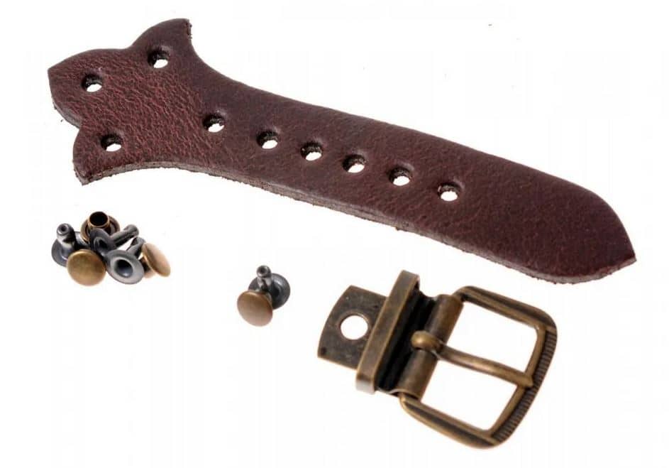 Dieser praktische Verschluss für Taschen besteht aus einem gelochten Riemen aus Leder, einer Aufniet-Schnalle und vier Hohlnieten.