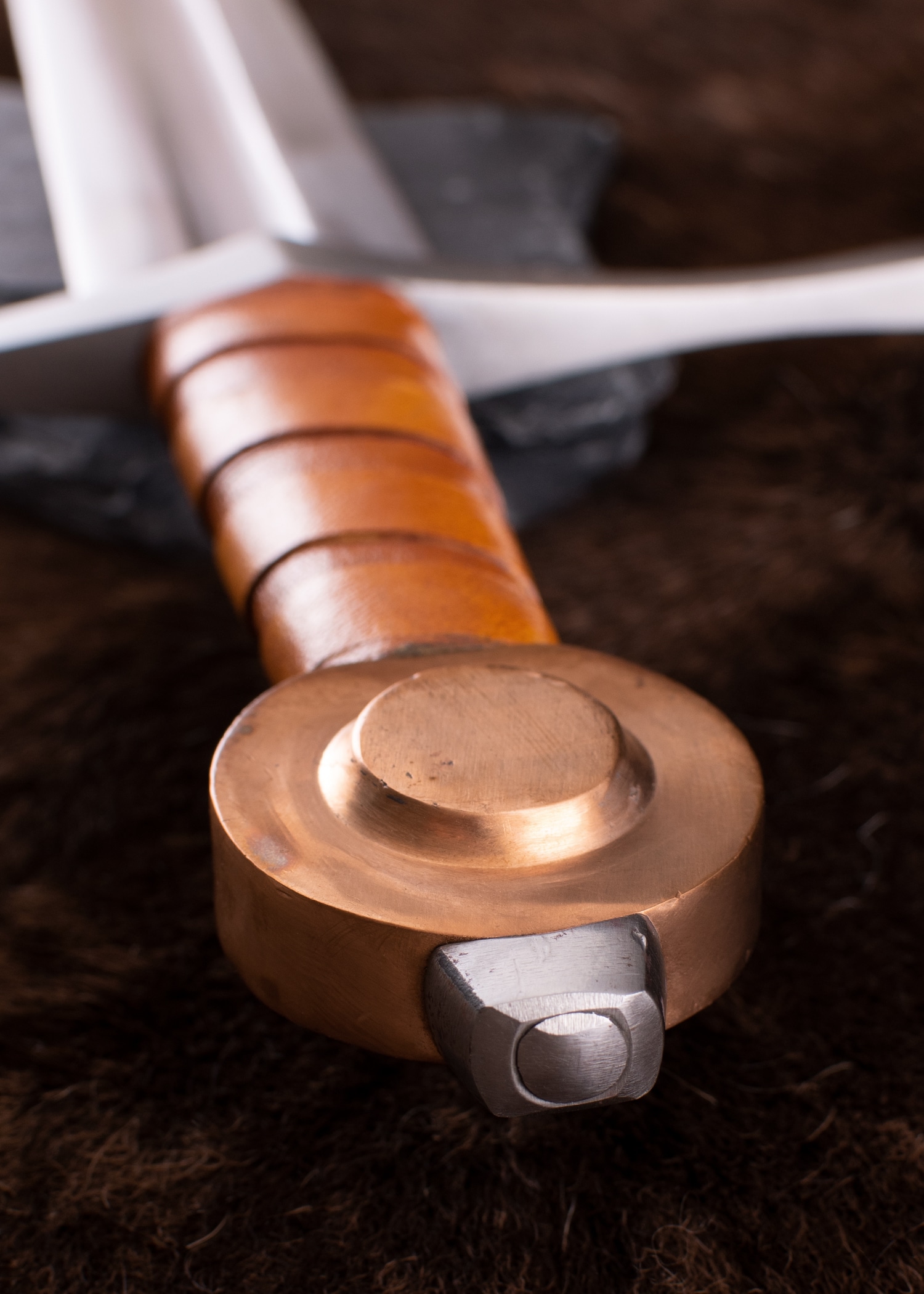 – Griffmaterial: Holz mit Lederwicklung, Knauf aus Bronze (gegossen), Parier und Nietblock aus Stahl