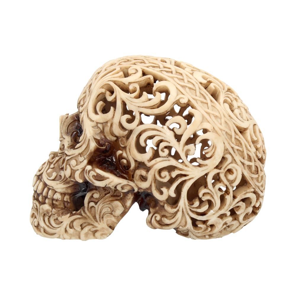 Dieser sehr spezielle Schädel ist mit keltischen Mustern verziert. Die durchbrochenen Stellen machen diesen Schädel zu einem skurilen Schaustück und lassen ihn echt erscheinen.