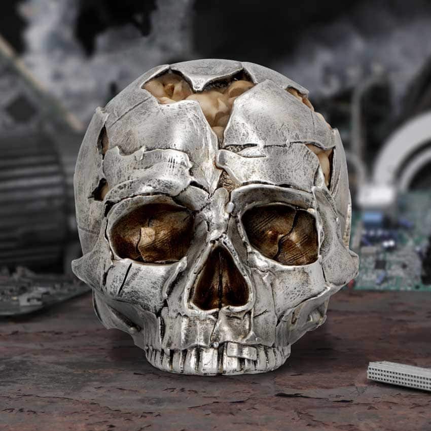 Dieser Schädel scheint, als sei er in einem uralten Ritual zerborsten. In den Rissen offenbaren sich kleinere Schädel, die wie ein verdorbenes Gehirn aus dem Inneren hervortreten und dem Werk eine verstörend lebendige Aura verleihen.