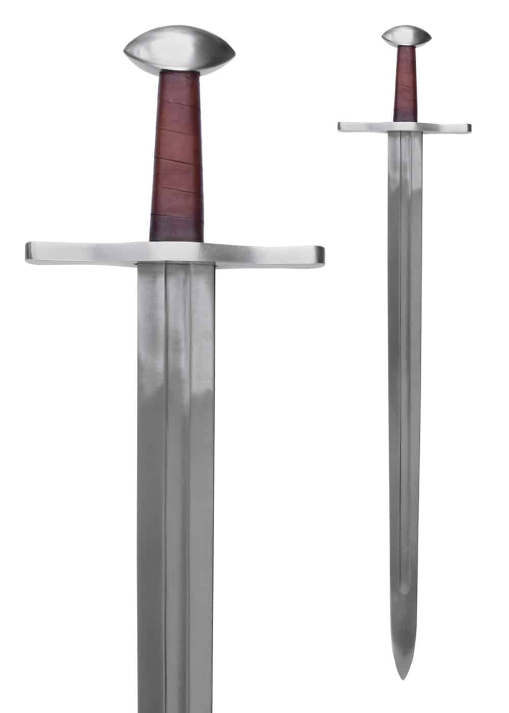 Diese originalgetreue Replik ersetzt den Dreispitzknauf durch die Paranuss-Form und das kurze, dicke Parierelement voriger Schwerter wird der dünneren, verlängerten und klassischen mittelalterlichen Kreuzform angepasst.