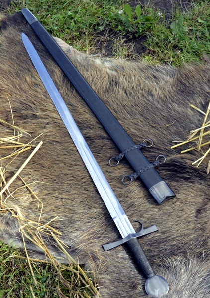 Das Schwert kommt mit einer lederbeschlagenen Holzscheide mit Beschlägen aus Stahl.