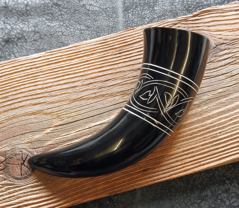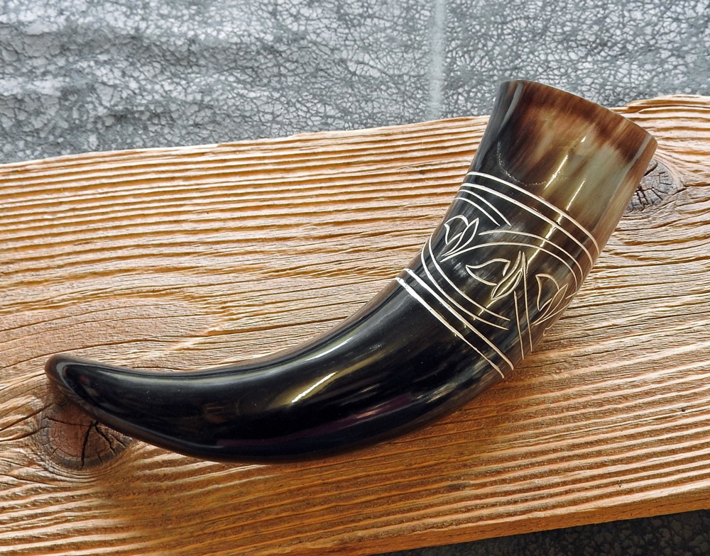 Ein prächtiges Horn mit schöner detaillierter Musterung, die ins Horn eingeritzt und mit weisser Farbe nachgezeichnet wurde.