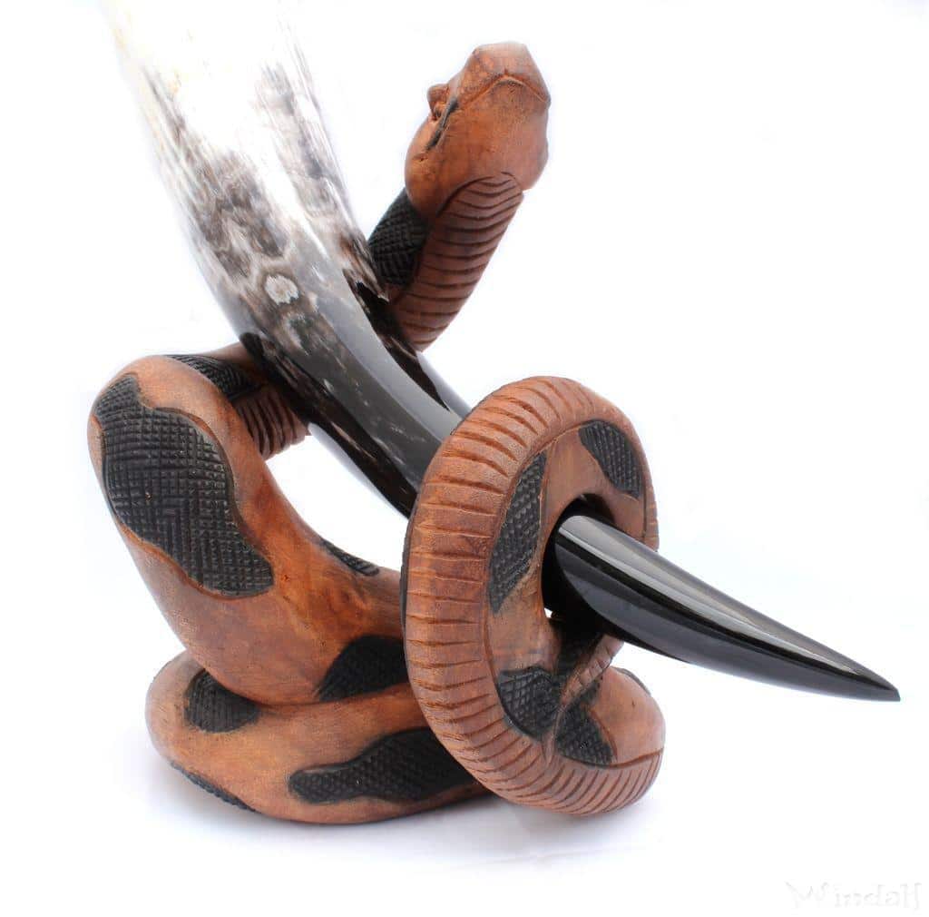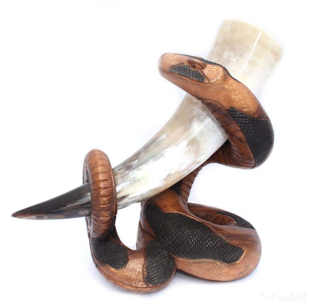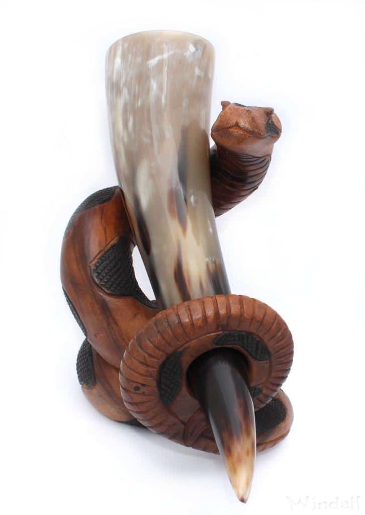 Dieser kunstvolle Trinkhornständer wurde von Hand aus Soarholz geschnitzt. Man kann ihn auch als Flaschenhalter nutzen!