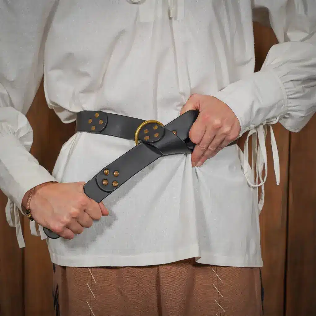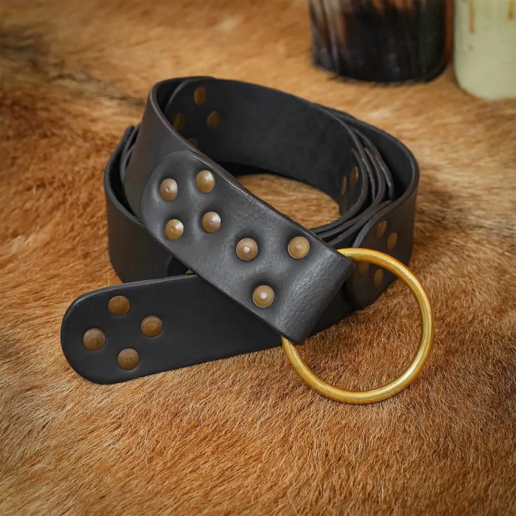 Dieser handgearbeitete Gürtel ist aus mehreren Lederstücken vernietet und mit einem massiven Messingring als Verschluss ausgestattet.