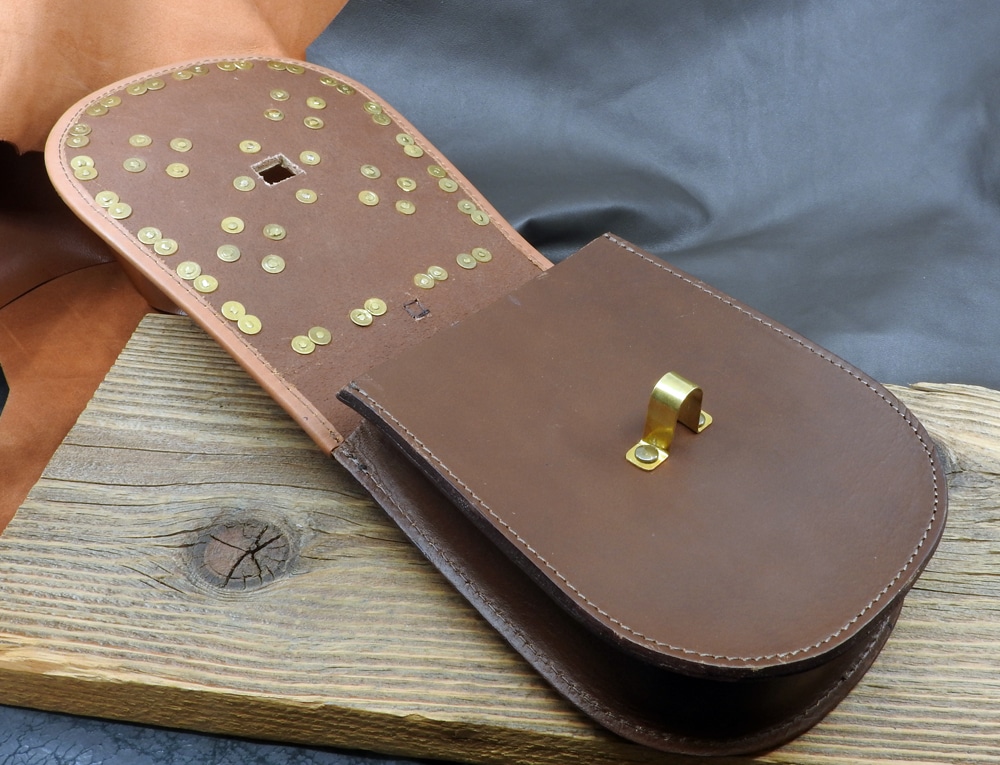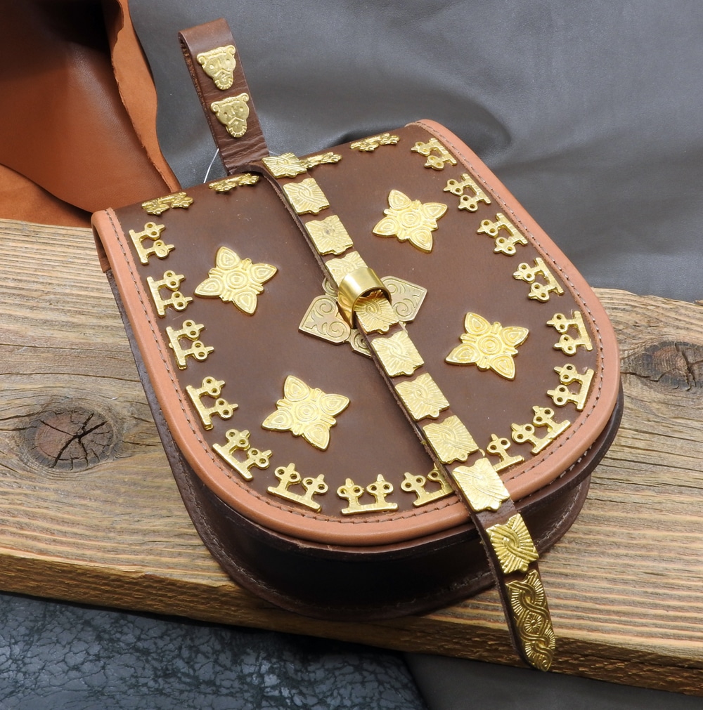 Der Durchlass und das Riemenende sind nach wikingerzeitlichen Funden nachgearbeitet, die Ziernieten waren vor allem bei den Wikingern und Rus im östlichen Raum beliebt und machen diese schöne Tasche zu einem wahren Schmuckstück.