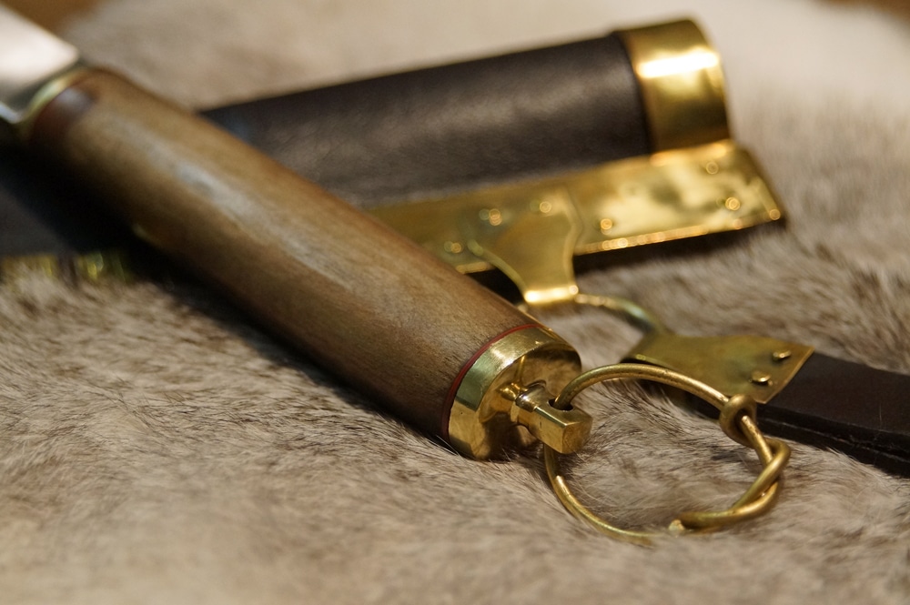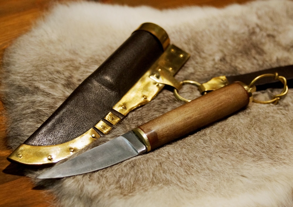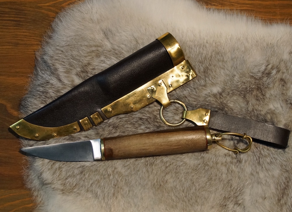 Schönes Messer mit Walnussholz-Griff in einer Lederscheide.