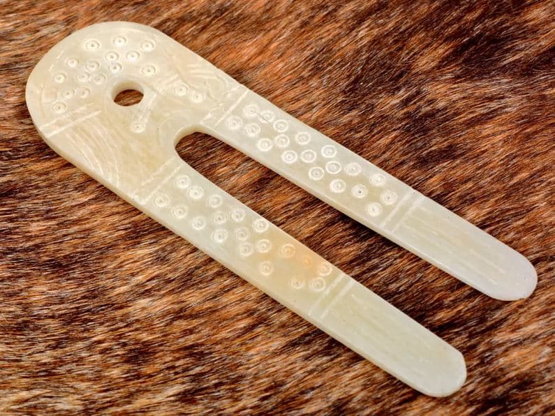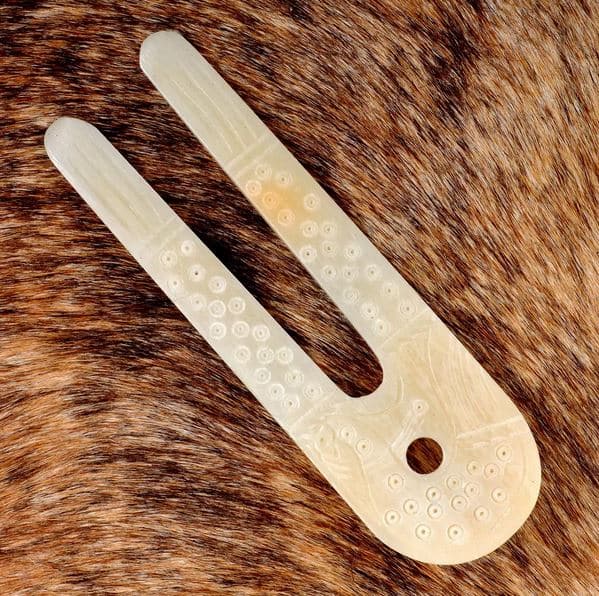 Diese Wikinger-Strickgabel aus Beinknochen zeigt ein geschnitztes Motiv, das einen Vogel darzustellen scheint und wurde nach einem wikingerzeitlichen Fund aus dem 9. Jh. gefertigt, der auf einem Bauernhof in Sømhovd in Nord-Norwegen gefunden wurde.